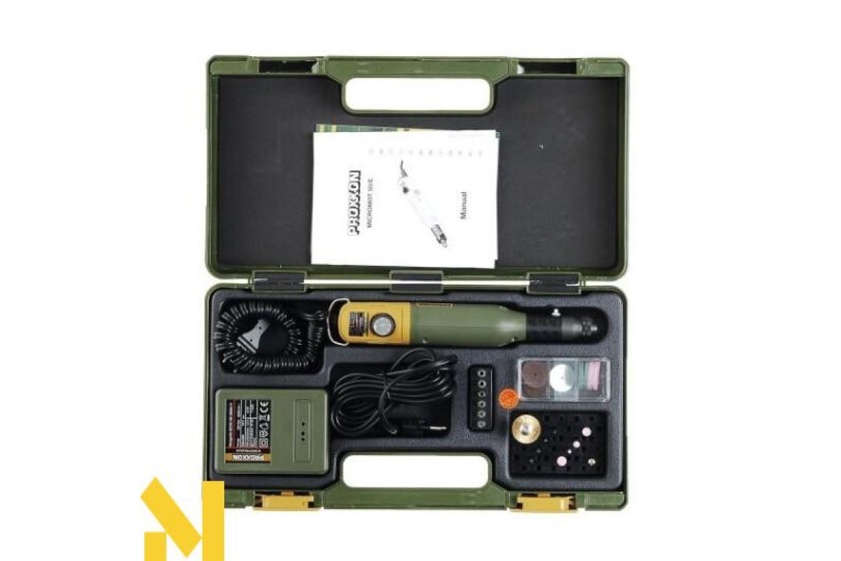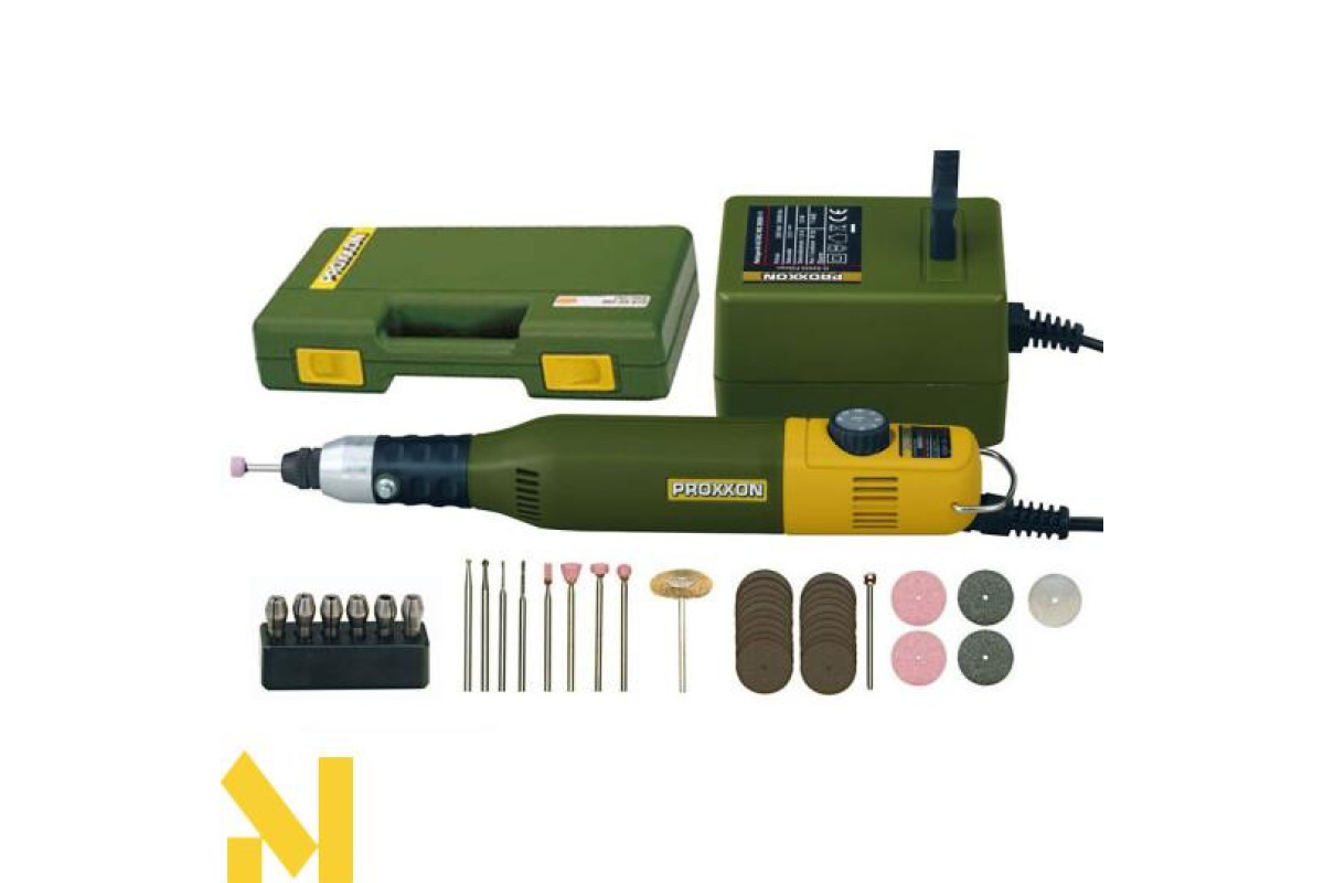 За допомогою портативної Proxxon Micromot 50 / E можна виконати цілий комплекс операцій, таких як фрезерування, свердління, шліфування, спилювання і навіть гравірування. Бормашини вже стали незамінними помічниками майстрів в різних сферах діяльності. Їх широко використовують багато професійні слюсарі, ювеліри і оптики. Компактна ручка, всього 35 мм в діаметрі, зручно фіксується в руці і полегшує процес експлуатації даного приладу. Бормашина оснащена спеціально розробленими шарикоподшипниками, що запобігають радіальне і осьове биття, а завдяки надійному двигуну забезпечується безпечна напруга в 12В. За допомогою даної моделі можна виконувати слюсарні роботи, які вимагають особливої точності. Електронне регулювання швидкісного режиму надає майстру повний контроль над процесом і можливість самому вибирати швидкість обробки для об'єктів різного роду.