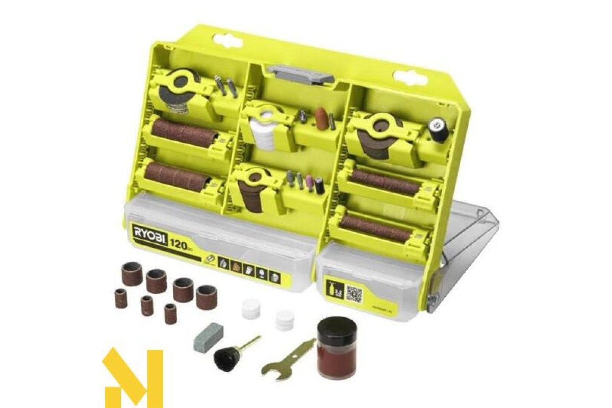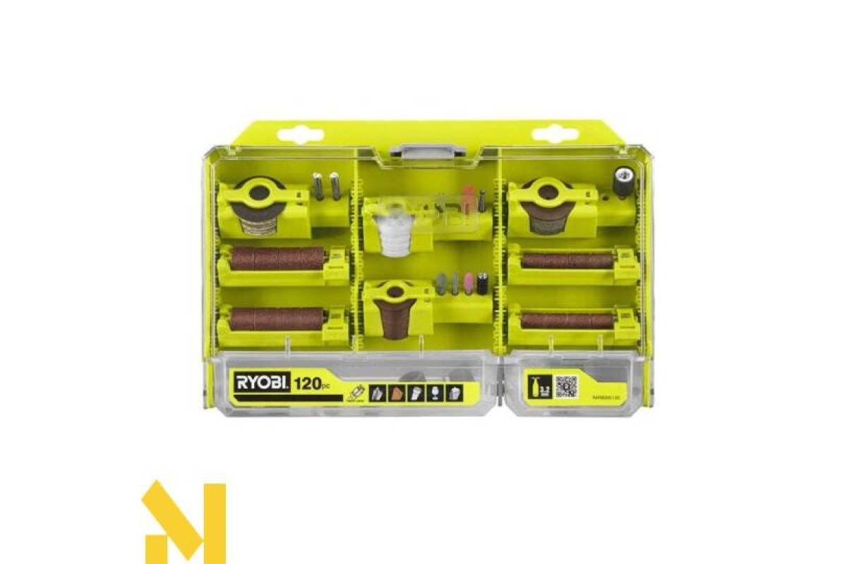 Комплект приладдя Ryobi RAR800K-120 (код товару: 5132005872) являє собою універсальний набір аксесуарів, що складається з 120 елементів, для мультишліфувальної машини. Всі аксесуари мають універсальний стрижень діаметром 3.2 мм (1/8"), що дозволяє легко замінювати насадки.