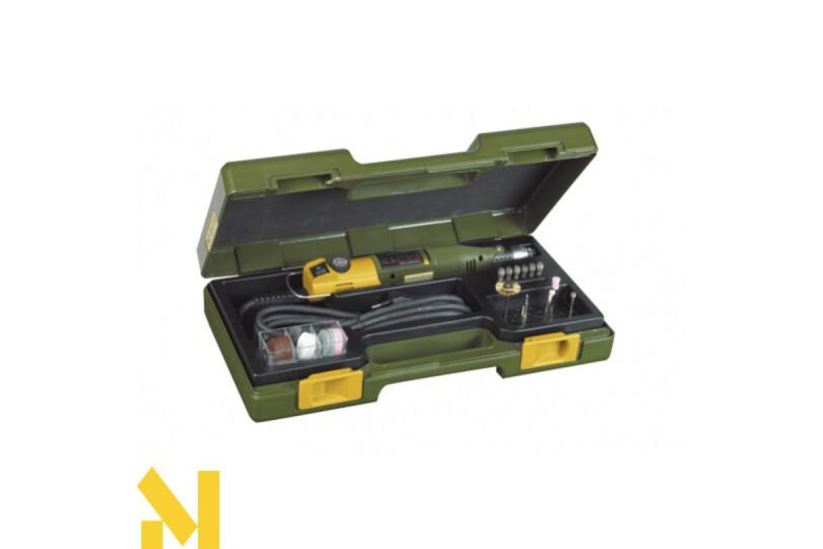 Діаметр корпусу всього 37 мм. Вага - 270 г. Унікальна машина в своєму класі. Для свердління, фрезерування, шліфування, полірування, різання, гравіювання і чищення. Корпус з посиленого скловолокном поліаміду з гумовою вставкою в районі шийки для зручного тримання двома пальцями (як ручку). Збалансований, малошумний спеціальний двигун постійного струму. Електронне регулювання швидкості від 6500 до 21500 об / хв. Крутний момент зберігається постійним навіть в діапазоні низьких швидкостей. Це важливо при мікросверленіі, зачистці і полірування. Шпиндель надійно фіксується натисканням кнопки для заміни робочого інструменту або зміни цанги. Шийка діаметром 20 мм дозволяє затискати бормашину у всіх станинах і власниках Proxxon.
