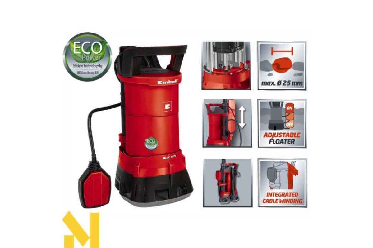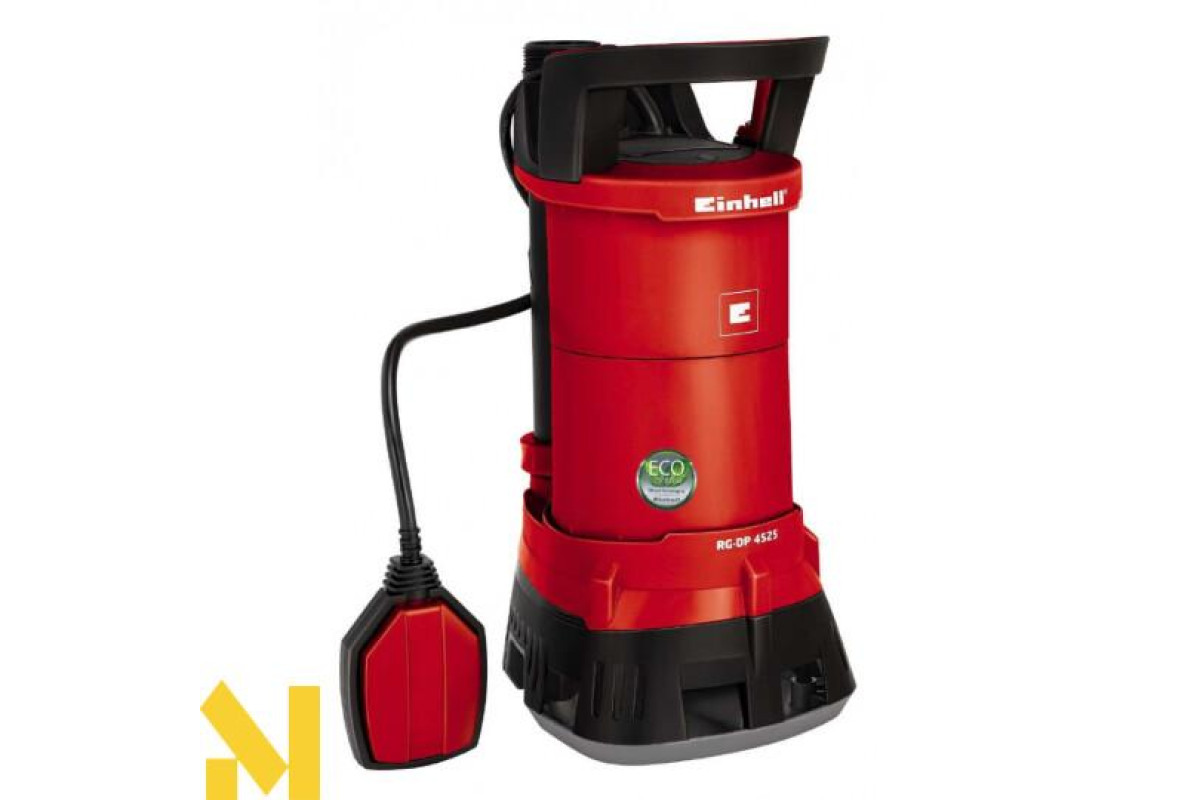 Новий надійний насос Einhell RG-DP 4525 ECO для відкачування забрудненої води з ємностей, резервуарів, затоплених підвалів і т.д. Пропускає частинки діаметром 25 мм. Оснащений поплавковим вимикачів для автоматичного режиму вмикання / вимикання при різному рівні води. Високоякісні матеріали, наприклад приводний вал, корпус і все кріплення виготовлені з нержавіючої сталі - це гарантує не схильність корозії і довгий термін служби. Корпус насоса Einhell RG-DP 4525 ECO зроблений з міцної пластмаси.