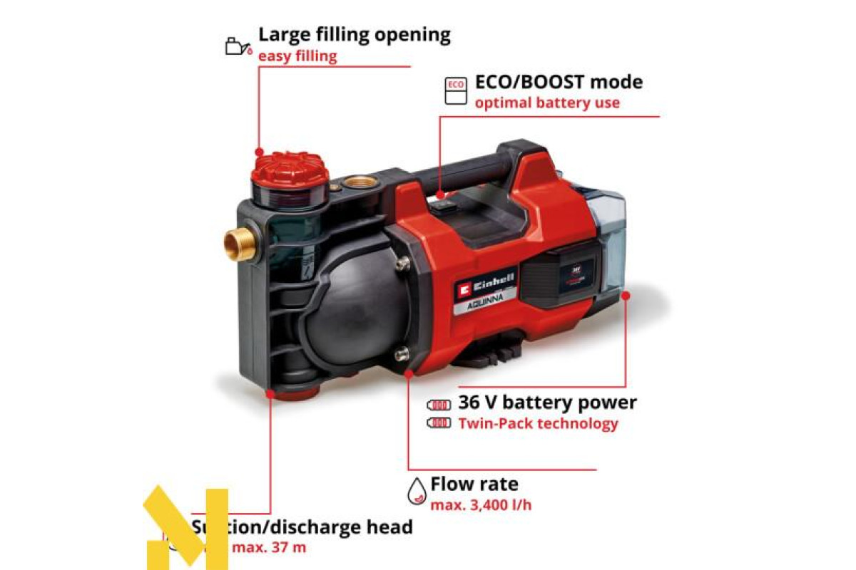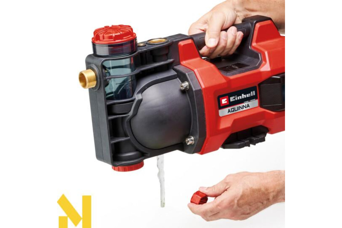 Садовий самовсмоктувальний насос акумуляторний Einhell AQUINNA 36/34 лінійки Power X-Change system серії Expert plus призначений для догляду за садом, має високу продуктивність, особливо добре підходить для зрошення, поливу саду або подачі води з резервуарів. Для живлення насосу використовують технологію Twin-Pack на 36 В, потужність двох батарей Power X-Change на 18 В поєднується для досягнення максимальної продуктивності. AQUINNA 36/34 може перекачувати до 3400 літрів води на годину з макс. тиском 3,7 бар. Насос має режим ECO і BOOST. Великий гвинт для заповнення водою для легкого заповнення насоса (необхідний для першого всмоктування)полегшує запуск, захист від замерзання забезпечується гвинтом для зливу води. Завдяки прозорому матеріалу навколо індикатора наповнення водою можна побачити рівень води з першого погляду. Захист від перевантаження захищає двигун від перегріву. Вбудована ручка для перенесення забезпечує зручне транспортування. Насос має монтажні отвори для фіксації на постійному місці використання. Насос поставляється без акумуляторів і зарядного пристрою.