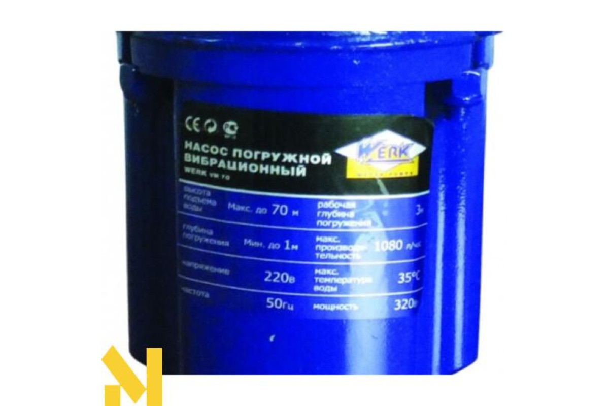 Вібраційний насос Верк VM70- призначений для підйому чистої води з колодязів, свердловин з внутрішнім діаметром не менше 100мм. Також даний вид насосів широко використовуються для перекачування води з відкритих водойм, наприклад, для поливу, або інших господарсько-побутових цілей. Популярність вібраційні насоси отримали завдяки надійності, невибагливості в роботі, невеликій вазі і універсальності. Відмінними рисами моделі Werk VM70 є хороша продуктивність (1080л/год) і велика висота подачі. Потужність мотора становить 320Вт, чого цілком вистачає для продуктивної роботи протягом тривалого часу. Насос має надійні гумові ущільнення, що виключають потрапляння води всередину.