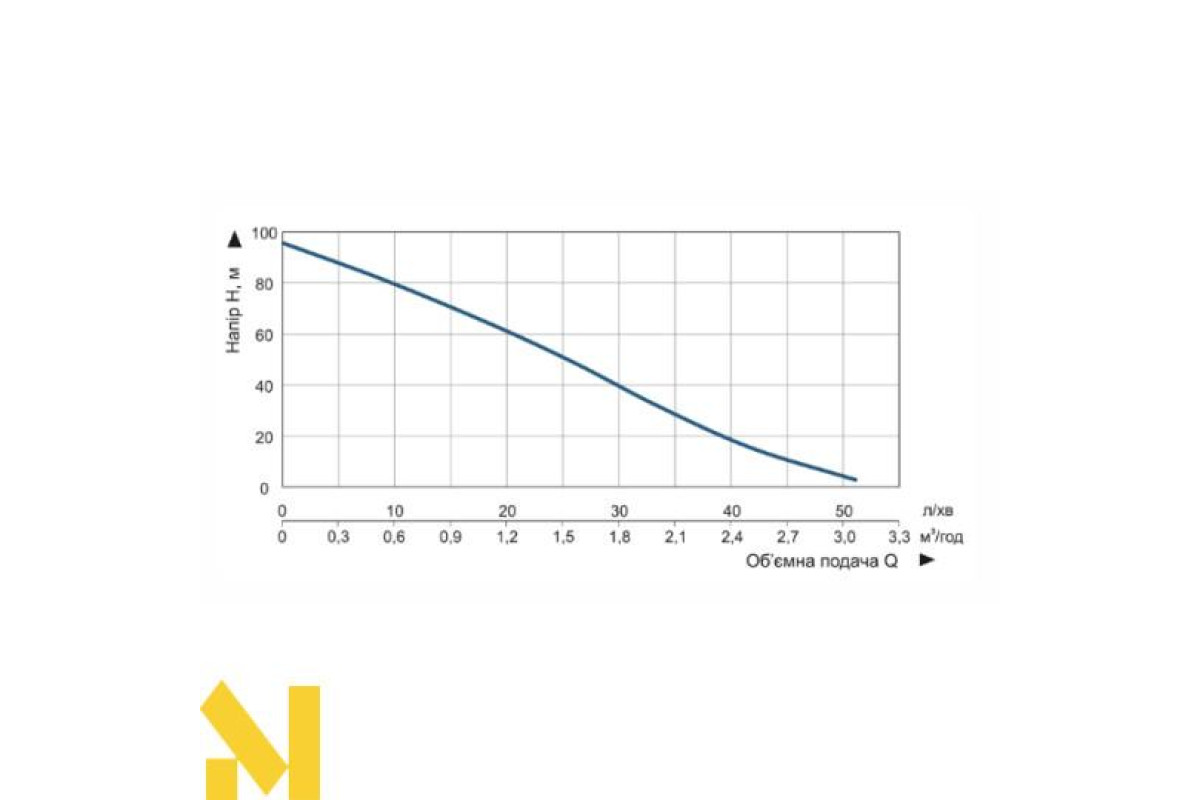 Напір (Н), м | 96 | 87 | 80 | 71 | 61 | 52 | 40 | 30 | 22 | 10 | 3 |