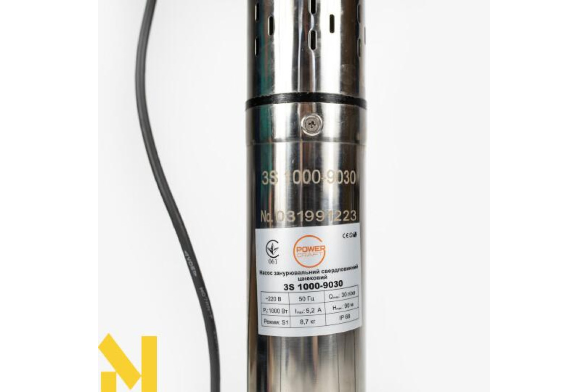 Насос занурювальний шнековий Powercraft 3S 1000-9030 призначений для подачі чистої води в побутових умовах зі свердловин внутрішнім діаметром 100 мм і більше, а також з шахтних колодязів, резервуарів і відкритих водойм для поливу садів і городів. Температура перекачуваної води повинна бути не вище 40° С і не нижче 1° С. Не допускається перекачування забруднених і кислотних рідин. Потужність двигуна становить 1000 Вт. Максимальний напір 90 метрів. Продуктивність 2.1 м3 в годину. Насос виготовлений з нержавіючої сталі. Робоче колесо шнекового типу виготовлено зі сталі. Діаметр вхідного отвору 1 дюйм.
