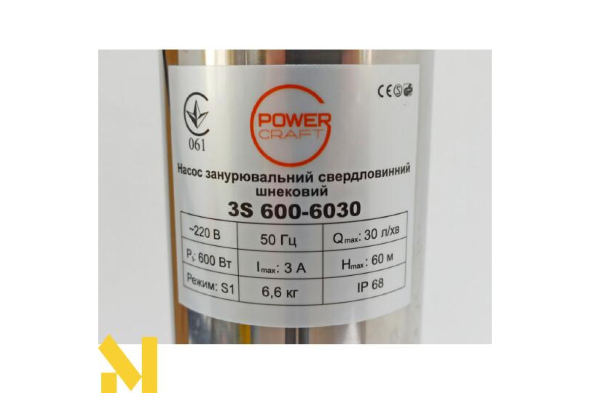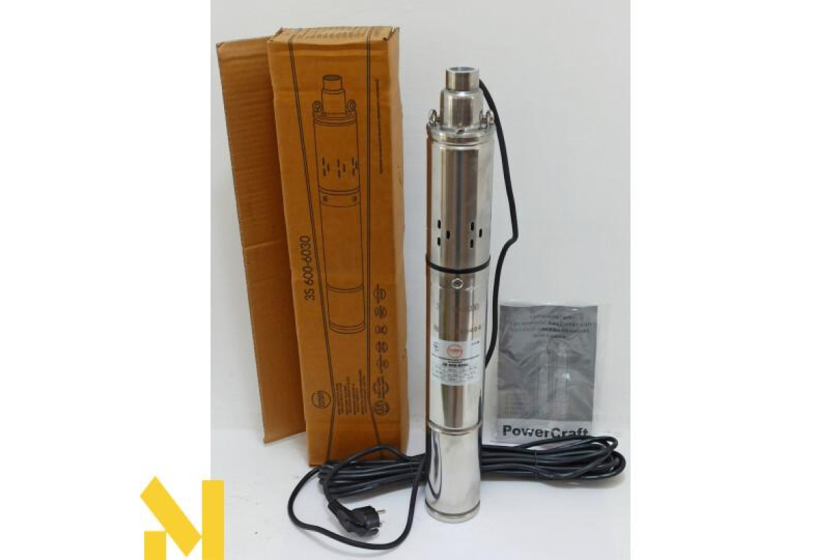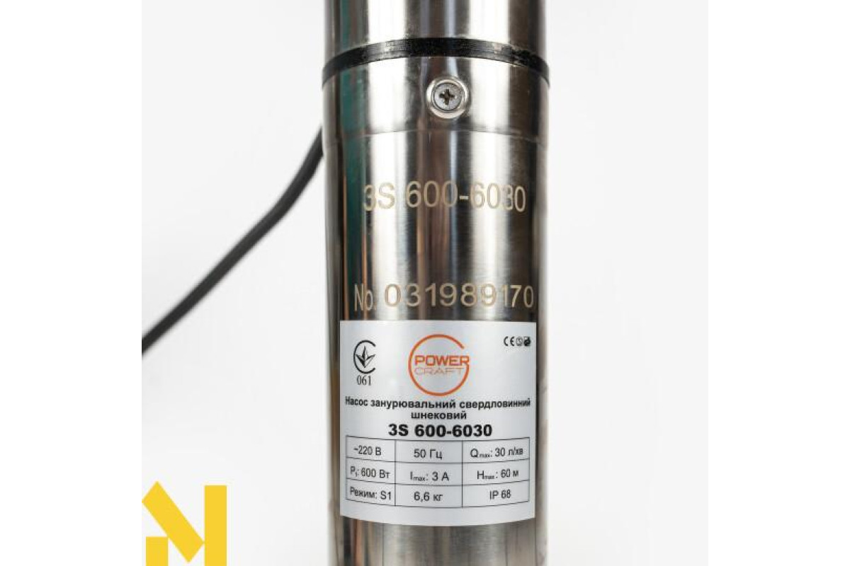Насос занурювальний шнековий Powercraft 3S 600-6030 призначений для подачі чистої води в побутових умовах зі свердловин внутрішнім діаметром 100 мм і більше, а також з шахтних колодязів, резервуарів і відкритих водойм для поливу садів і городів. Температура перекачуваної води повинна бути не вище 40° С і не нижче 1° С. Не допускається перекачування забруднених і кислотних рідин. Потужність двигуна становить 600 Вт. Максимальний напір 60 метрів. Продуктивність 1,7 м3 в годину. Насос виготовлений з нержавіючої сталі. Робоче колесо шнекового типу виготовлено зі сталі. Діаметр вхідного отвору 1 дюйм.