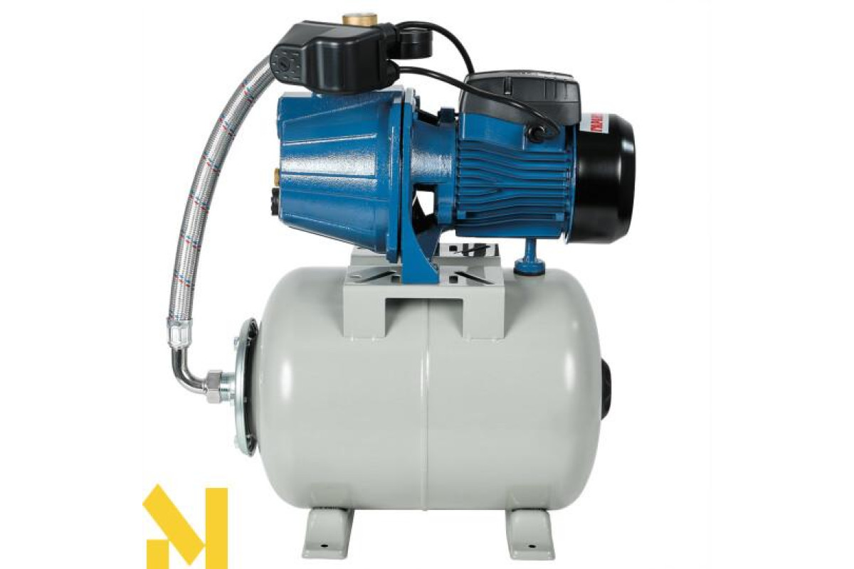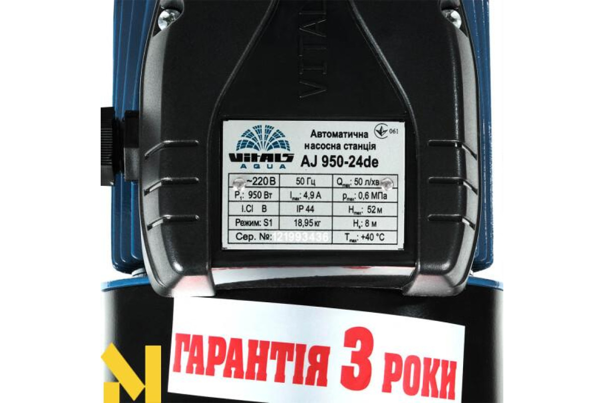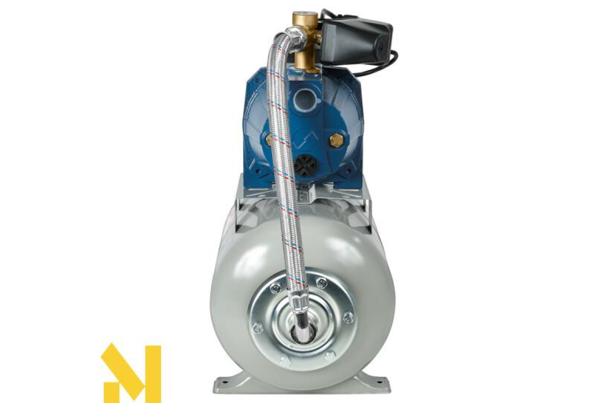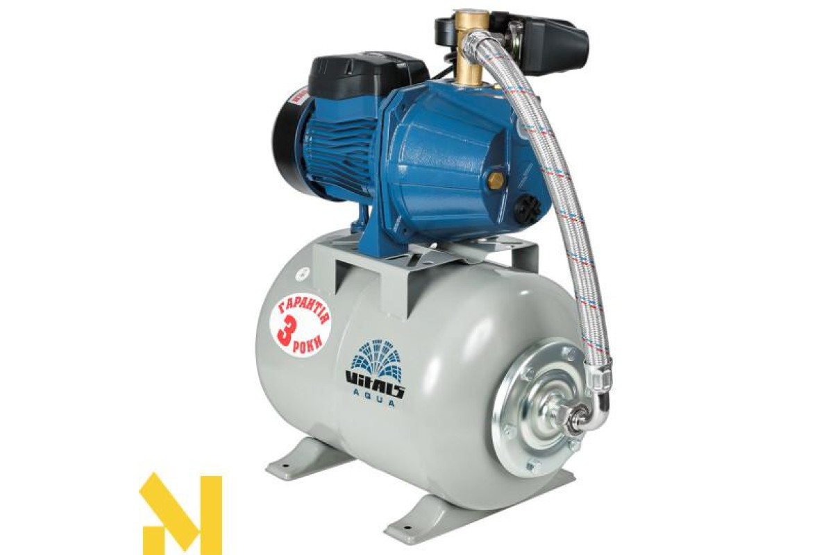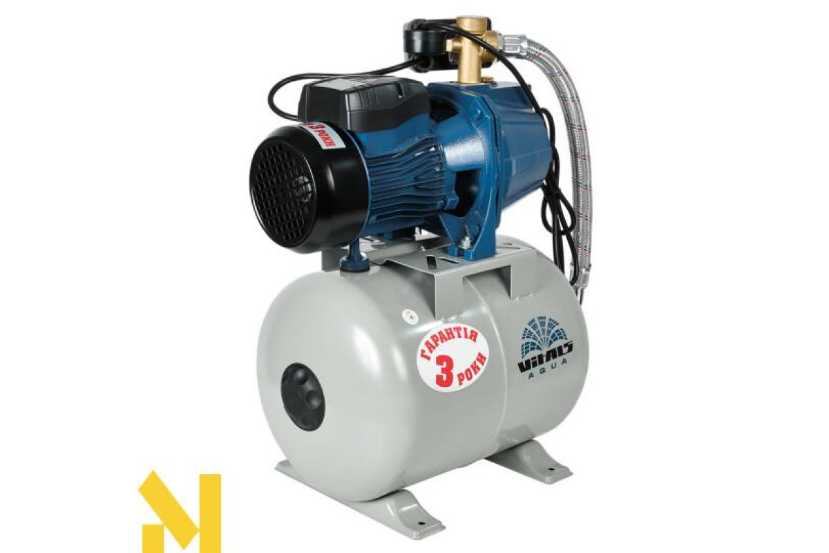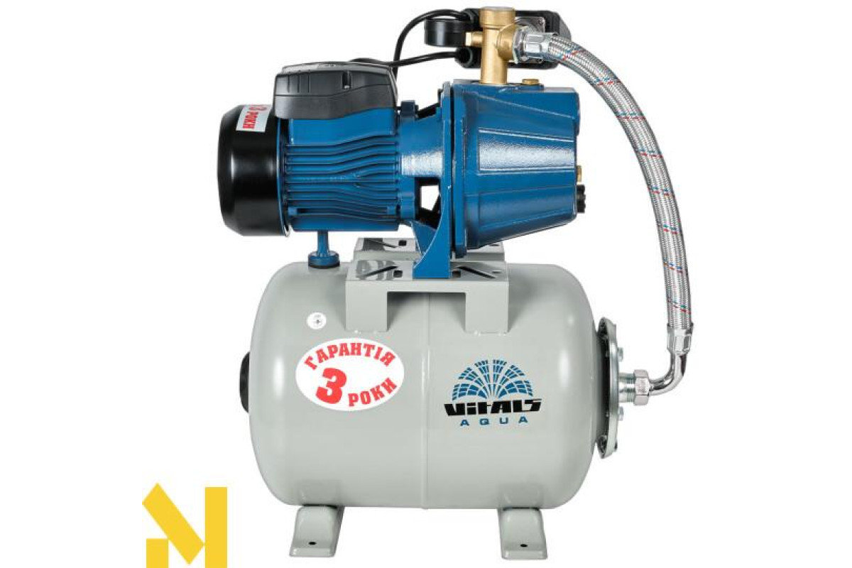 Насосна станція струминна Vitals Aqua AJ 950-24de обладнана консольним роторним відцентровим самовсмоктувальним насосом серії J з внутрішнім ежектором. Насоси цього типу забезпечують стабільність параметрів потоку води в разі зміни умов роботи, найчастіше їх використовують, коли необхідно отримати великий обсяг води, що перекачується, забезпечивши водночас стабільність характеристик водного потоку й уникнувши необхідності заливання води під час кожного запуску. Щоб уникнути частих вмикань і вимикань насоса, і щоб тиск у системі змінювався не стрибкоподібно, а плавно, у конструкції станції передбачено гідроакумулятор (сталевий розширювальний бак з еластичною мембраною) місткістю 24 літри.