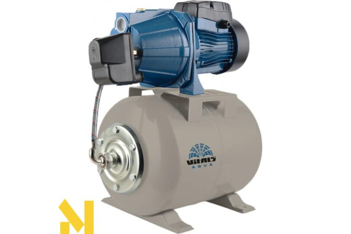 Насосна станція струминна Vitals Aqua AJ 745-24de оснащена консольним роторним відцентровим самовсмоктувальним насосом серії J з внутрішнім ежектором. Насоси цього типу забезпечують стабільність параметрів потоку води при зміні умов роботи, найчастіше їх використовують у тих випадках, коли необхідно отримати великий обсяг води, що перекачується, забезпечивши при цьому стабільність характеристик водного потоку і уникнувши необхідності заливки води при кожному запуску. Щоб уникнути частих включень і вимкнень насоса, і щоб тиск у системі змінювався не стрибкоподібно, а плавно, в конструкції станції передбачений гідроакумулятор (сталевий розширювальний бак з еластичною мембраною) ємністю 24 літри.