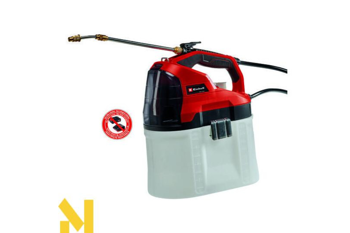 Бездротовий обприскувач Einhell GE-WS 18/75 Li-Solo допомагає в розподілі засобів захисту рослин, добрив і боротьби з бур'янами і є членом гнучкого сімейства Power X-Change. Обприскувач під тиском оснащений автоматичним насосом. Шкала на прозорому резервуарі дозволяє швидко визначити рівень заповнення. Великі металеві ручки на резервуарі призначені для полегшення відкривання і закривання. Латунне сопло регулюється індивідуально. Телескопічна розпилююча трубка виготовлена з нержавіючої сталі і оснащена блокуючою кнопкою управління. Ремінь для перенесення з м'якою підкладкою знижує навантаження на роботу. Кришка акумуляторного відсіку захищає від бризок води. Акумулятор і зарядний пристрій можна придбати окремо.