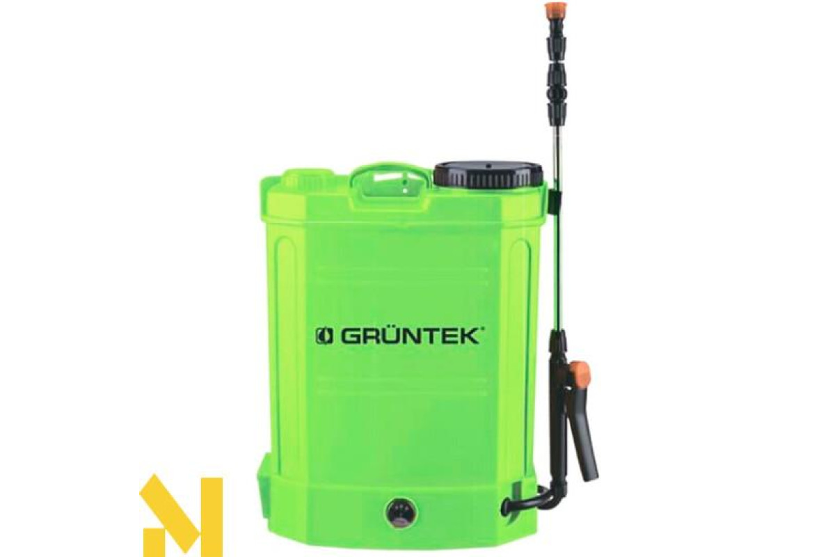 Обприскувач акумуляторний GRUNTEK BS-12-3BP - апарат, призначений для розпилення добрив, пестицидів, інших рідин. Оснащений пластиковим баком об'ємом 12 л, який розрахований на робочий тиск 1,5-4 бар. Найважливішою перевагою моделі є наявність ємного свинцевого акумулятора 8А/год / 12В, заряду якого вистачає на розпорошення 16-22 повних баків з розчином.
