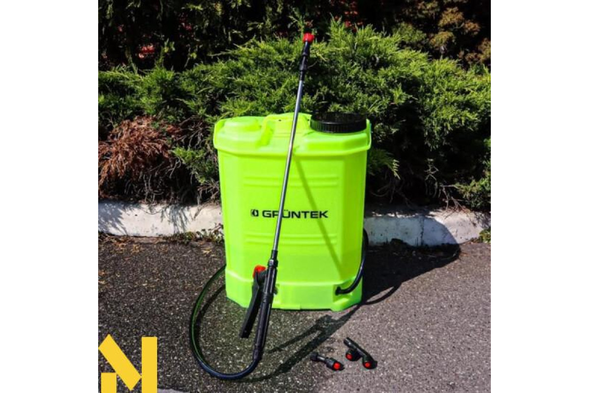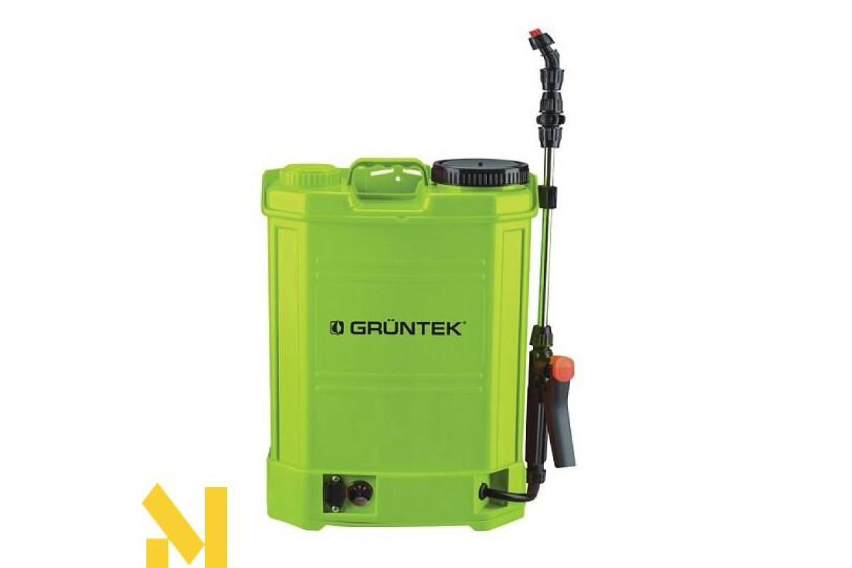 Обприскувач акумуляторний GRUNTEK BS-16-3BP - апарат, призначений для розпилення добрив, пестицидів, інших рідин. Оснащений пластиковим баком об'ємом 16 л, який розрахований на робочий тиск 1,5-4 бар. Найважливішою перевагою моделі є наявність ємного свинцевого акумулятора 8 А/год / 12В, заряду якого вистачає на розпорошення 16-22 повних баків з розчином.
