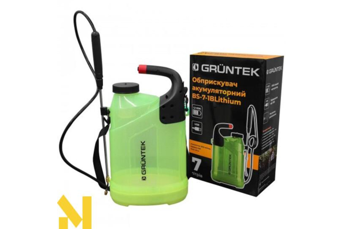 Обприскувач акумуляторний GRUNTEK BS-7-3Blithium - апарат для розпилення добрив, пестицидів, інших рідин. Оснащений пластиковим баком об'ємом 7 л, який розрахований на робочий тиск 1,5-4 бар. Найважливішою перевагою моделі є наявність ємного літій-іонного акумулятора (із захистом від перезаряджання), який дозволяє користувачеві не виконувати постійне ручне нагнітання повітря в бак.