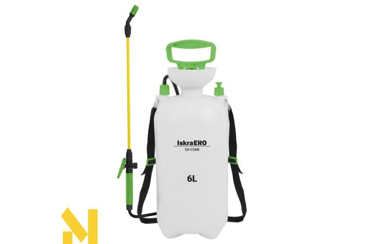 Плечовий ручний обприскувач об'ємом 6 л, з функцією постійного розпилення та кнопкою скидання тиску.