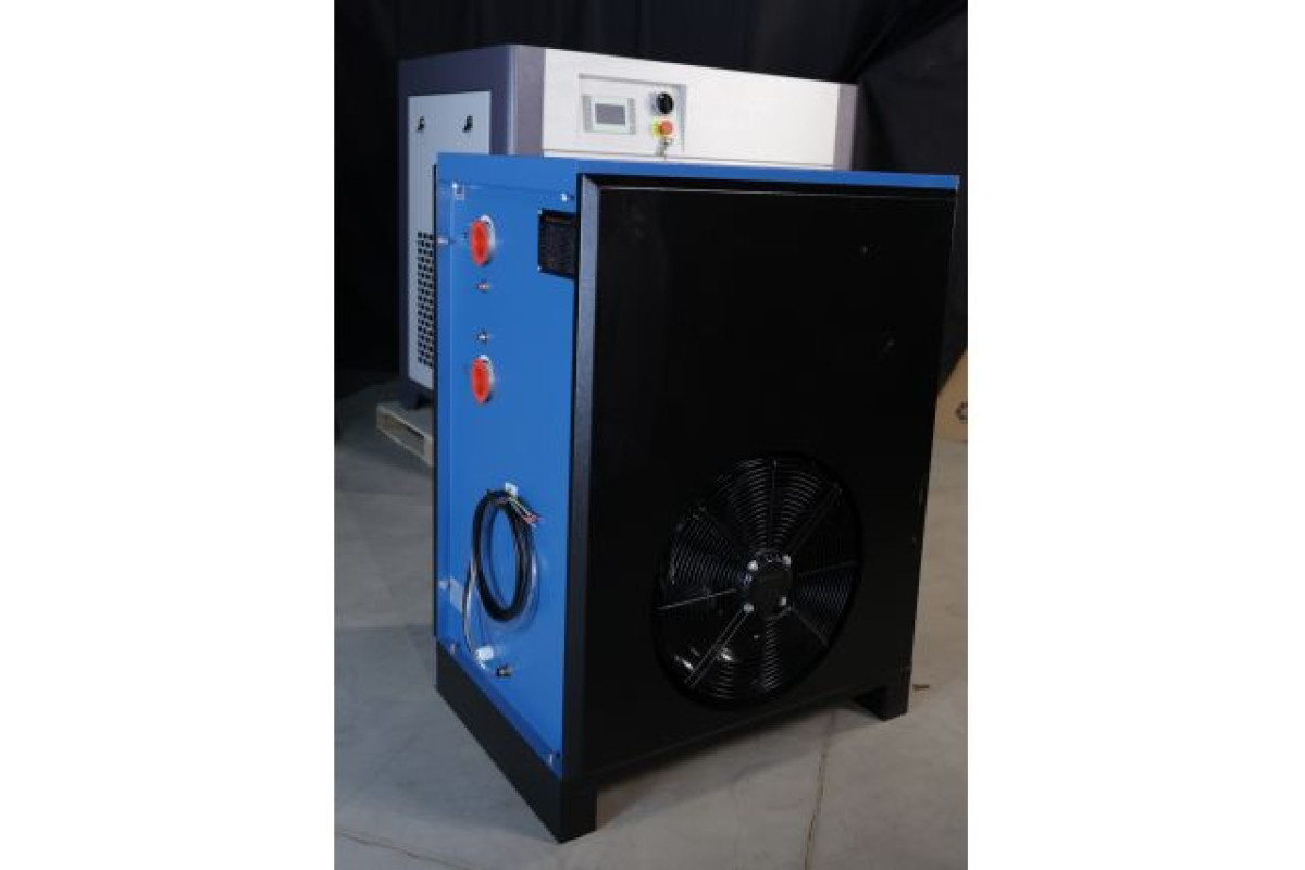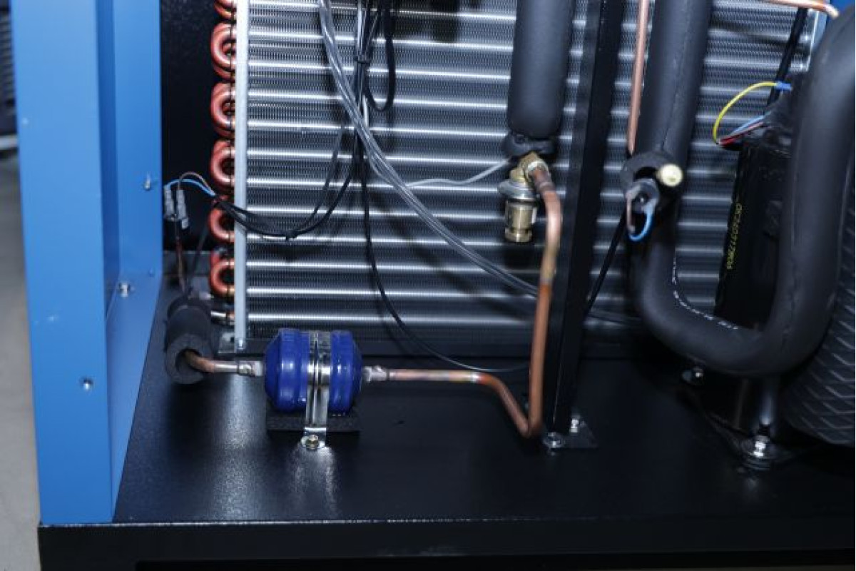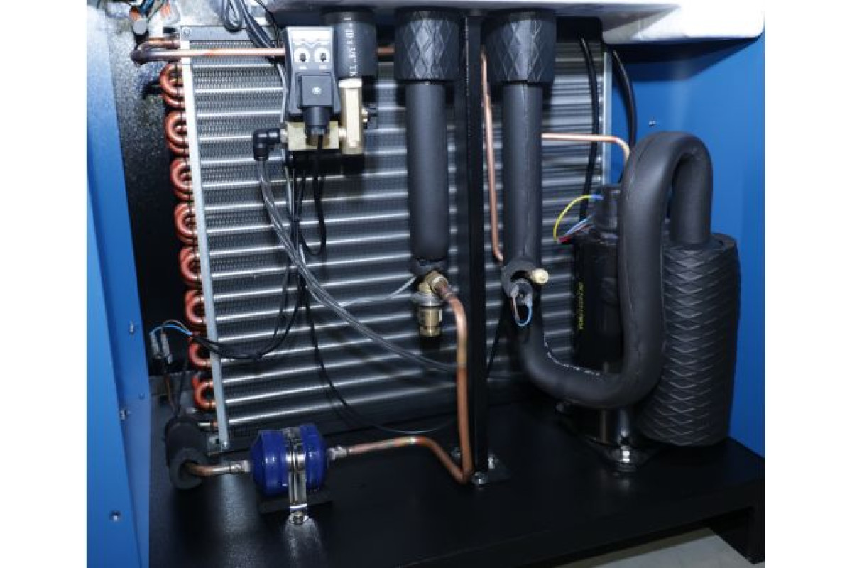 Стиснене повітря переміщується у випарник контуру охолодження, де його температура знижується за рахунок коефіцієнта охолоджуючої рідини. Внаслідок цього масло і вода у стисненому повітрі розріджуються і, при проходженні стисненого повітря через сепаратор, відокремлюються у формі конденсату й видаляються через автоматичний зливний клапан. Після цього повітря повертається у теплообмінник, де знову нагрівається, що дає змогу додатково зменшити його відносну вологість.