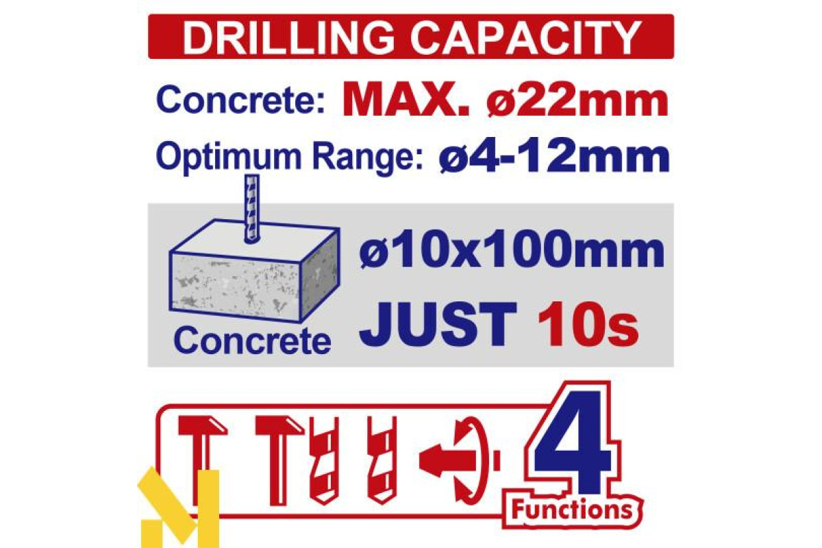 Три режими роботи: Перфоратор підтримує три основні режими роботи: звичайне свердління, ударне свердління та долблення. Це дозволяє з легкістю адаптувати інструмент до різних завдань.