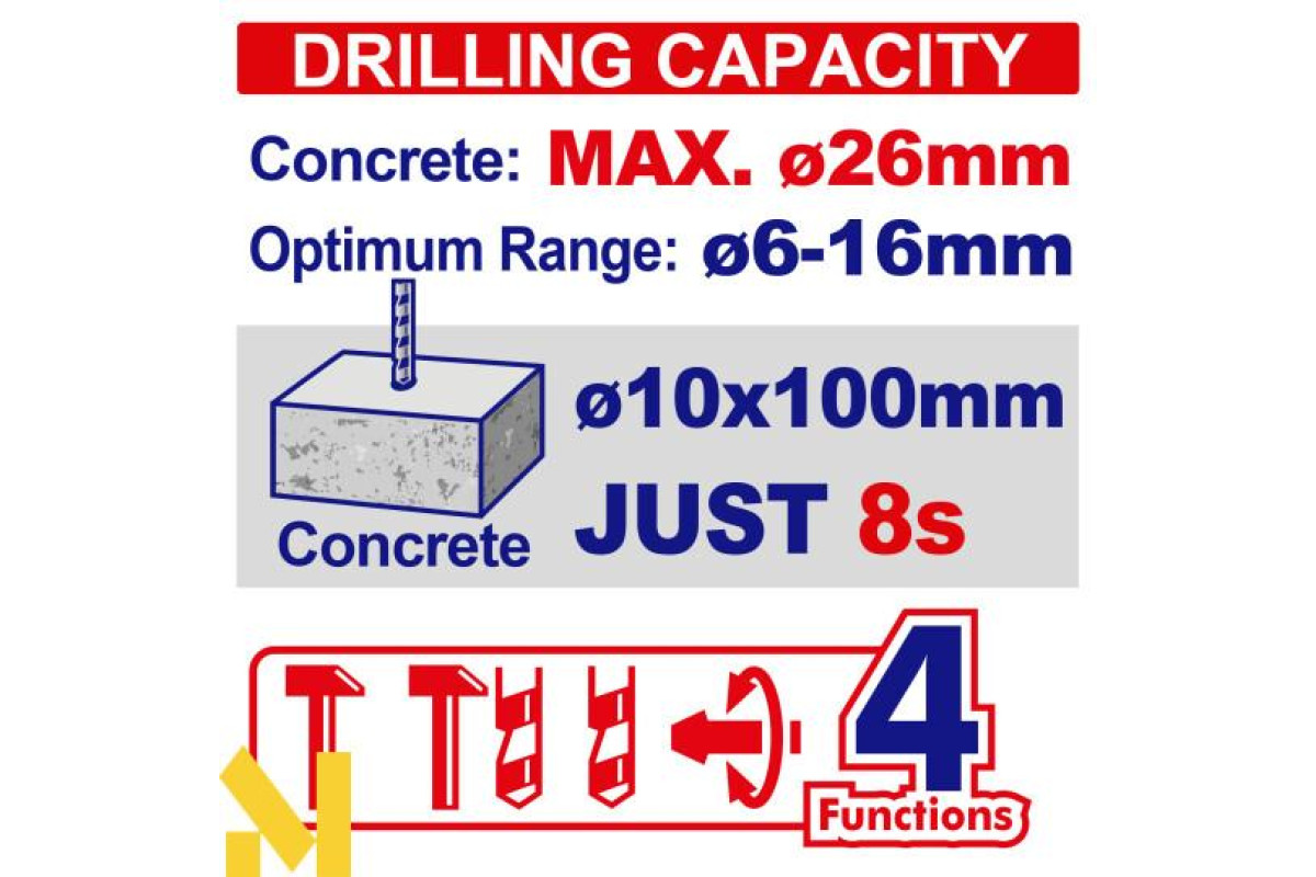 Максимальна потужність свердління: | Бетон: 26 мм Сталь: 13 мм Дерево: 30 мм |