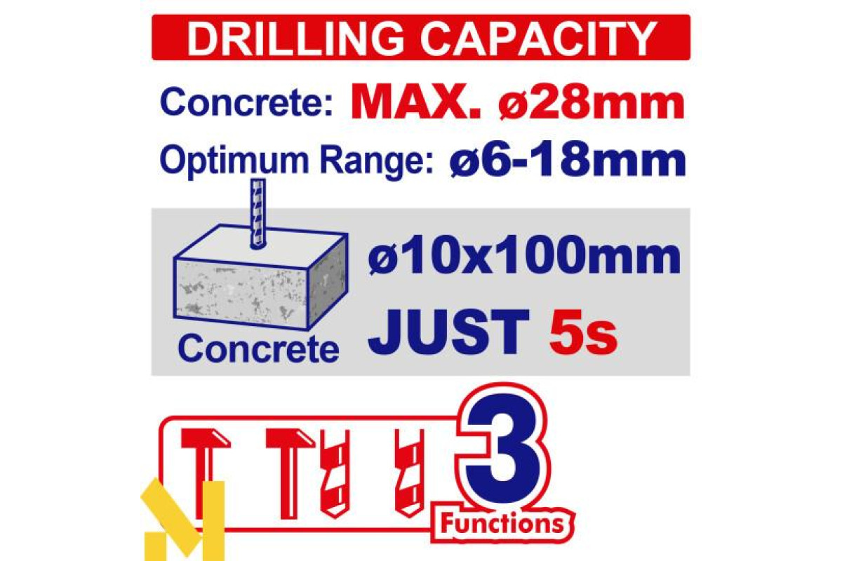 Максимальна потужність свердління: | Бетон: 28 мм Сталь: 13 мм Дерево: 40 мм |