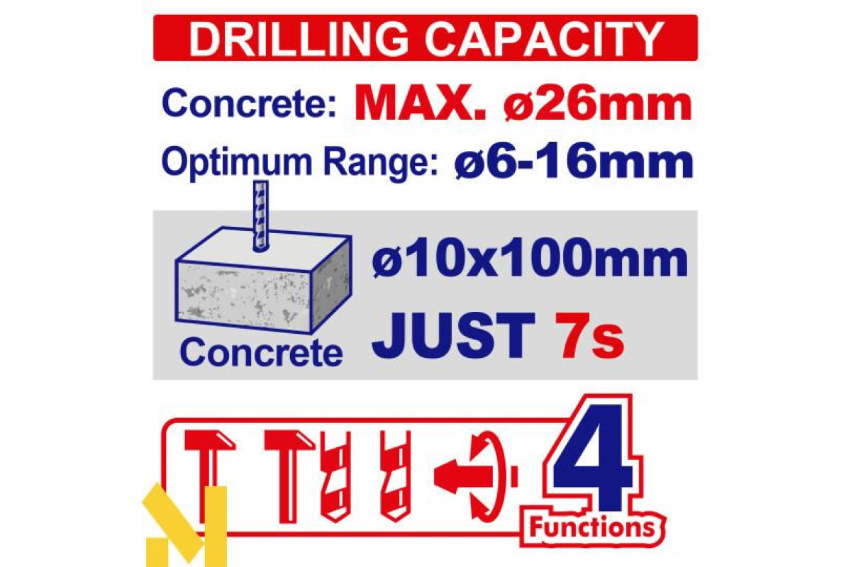 Максимальна потужність свердління: | Бетон: 26 мм Сталь: 13 мм Дерево: 30 мм |