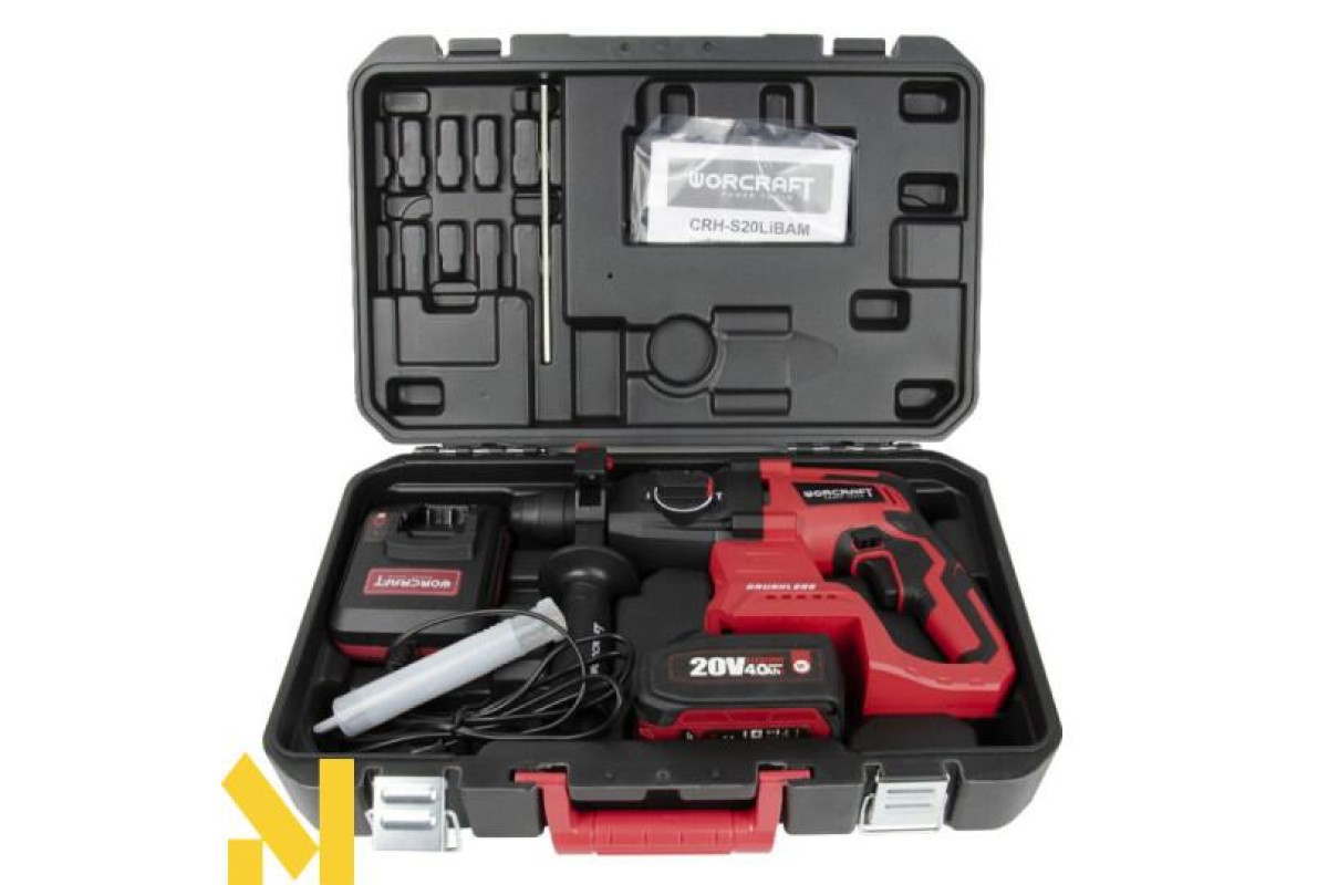 Акумуляторний перфоратор WORCRAFT CRH-S20LiBAM поставляється в комплекті з акумулятором CLB-20V-4.0HC, зарядним пристроєм і міцним пластиковим кейсом.