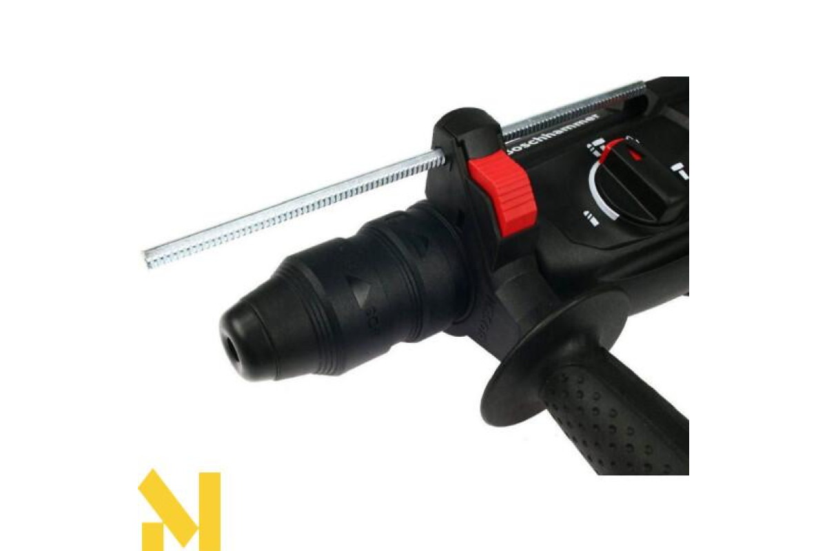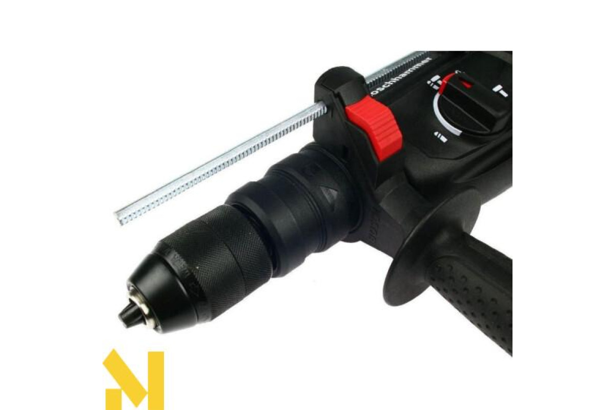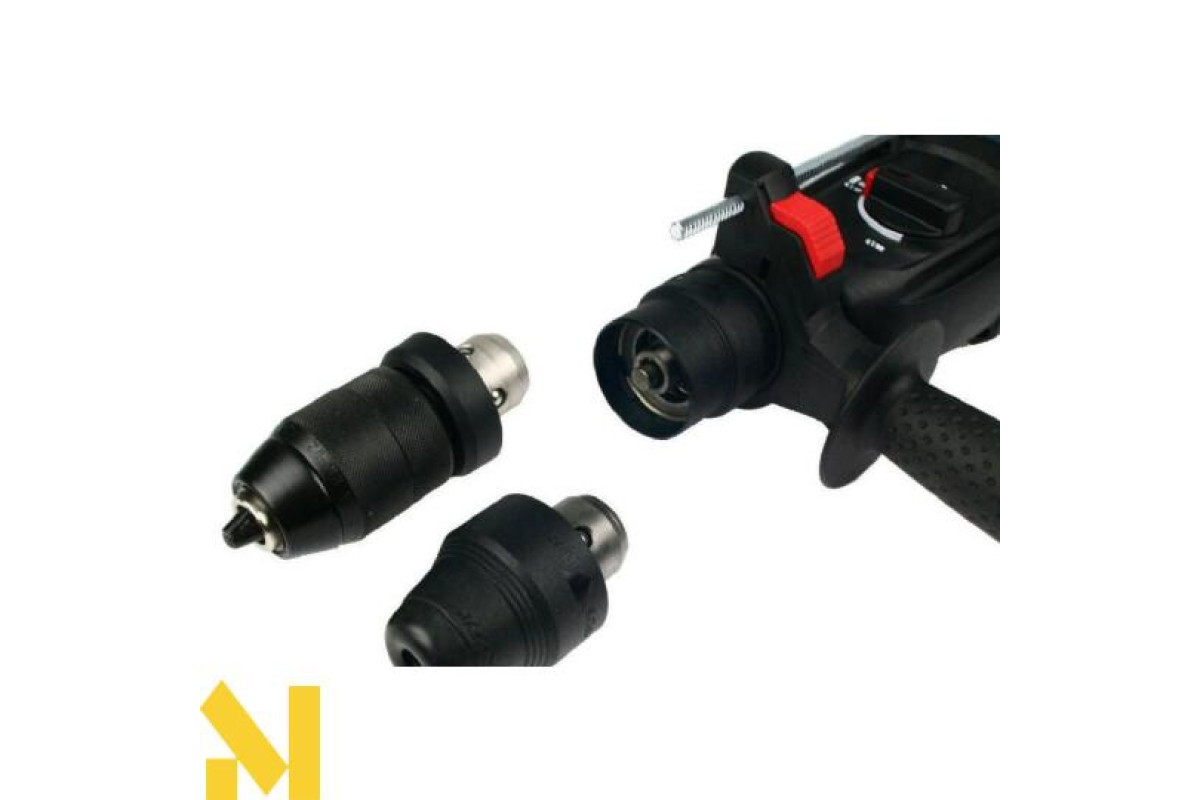 Модель оснащена змінним SDS-патроном. Він повністю змінюється на трикулачний, що дозволяє свердлити отвори в металі і дереві використовуючи звичайні циліндричні свердла.