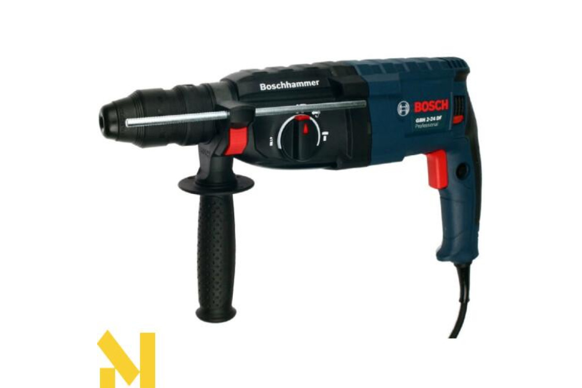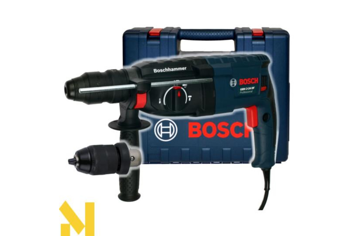 Комплектація. У комплект входить перфоратор GBH 2-24 DFR, патрон SDS-Plus, швидкозажимний патрон 13 мм, додаткова рукоятка, обмежувач глибини на 21 см. і пластиковий кейс.