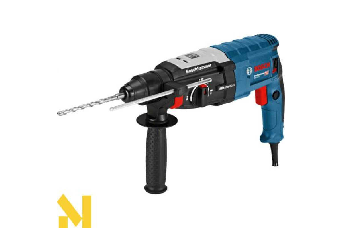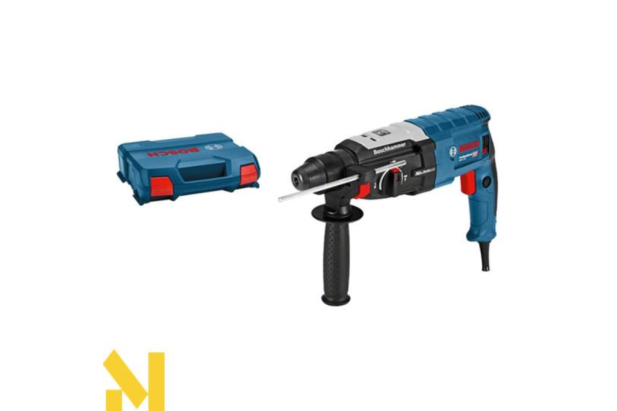 Перфоратор BOSCH GBH 2-28 Professional - максимально продуктивний і потужний електроперфоратор для загвинчування, свердління і довбання. Перфоратор BOSCH GBH 2-28 Professional оснащений інтелектуальною системою KickBack Control і антивібраційною системою, що зводить ризик травматизму і втоми оператора до мінімуму. Надійність перфоратора BOSCH GBH 2-28 Professional забезпечує корпус редуктора з магнію, запобіжною муфтою і реверсом для вилучення заклинило в заготівлі бура. Для точного початку свердління в перфоратори BOSCH GBH 2-28 Professional використовується плавне регулювання швидкості обертання.