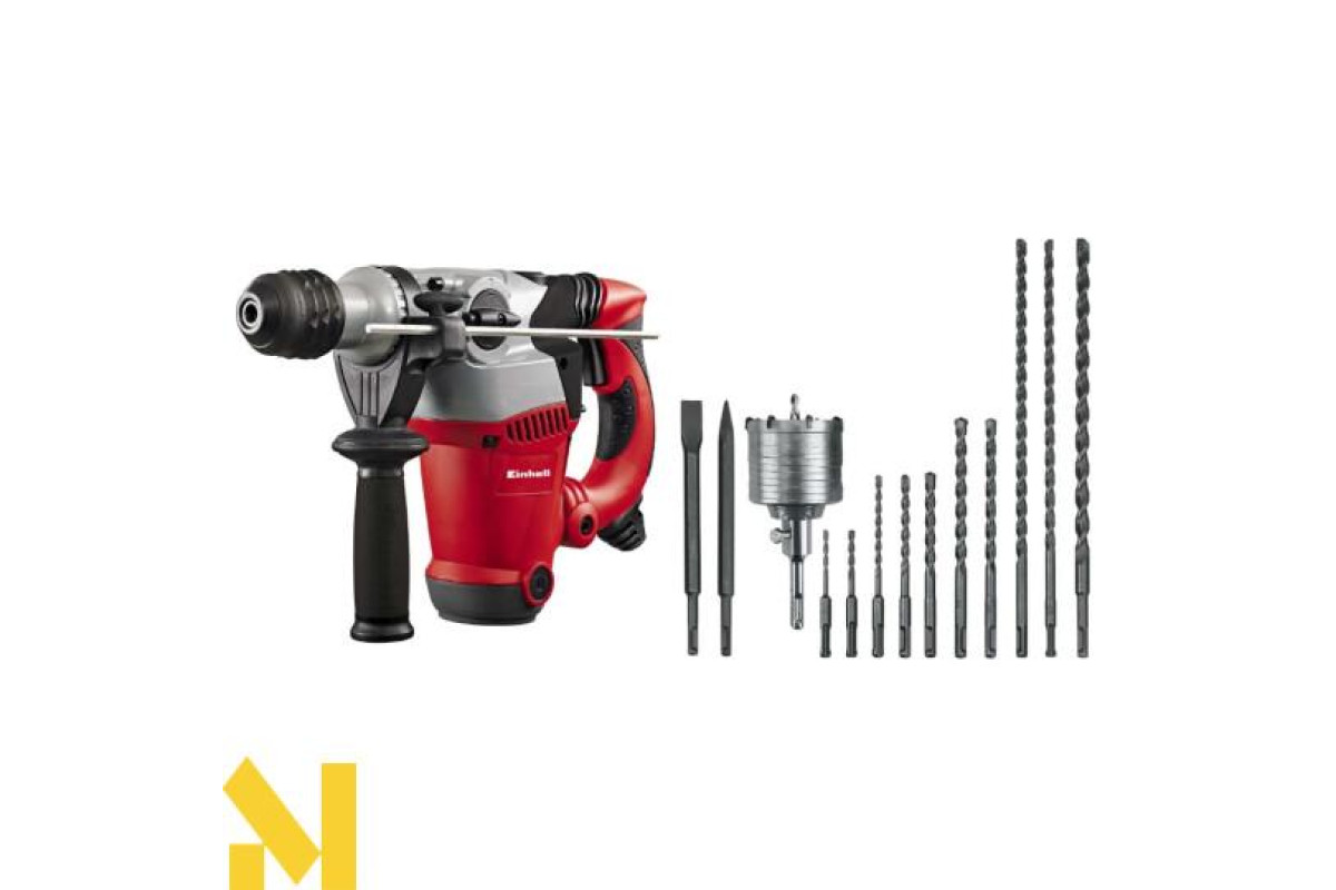 Перфоратор EINHELL RT-RH 32 KIT 4258485 надійний і потужний інструмент, здатний витримувати суттєві навантаження. Даний інструмент чудово впорається зі свердлінням в бетоні, камені і цеглі із застосуванням потужного удару. А також зі свердлінням без удару в дереві, стали і кераміці. Модель має три режими роботи: ударний, ударно-обертальний і обертальний. Перфоратор оснащений електронним регулюванням швидкості, функцією реверсу і поліпшеною системою пиловідведення. Для надійного утримання інструменту в руках і зниження вібрацій при роботі є гумові вставки на корпусі. Сам корпус виготовлений з міцного ударостійкого пластику. Коли Ви візьмете інструмент в руки, відразу ж відчуєте, що працювати з ним буде зручно. Інструмент поставляється в пластиковому кейсі з посиленою комплектацією.