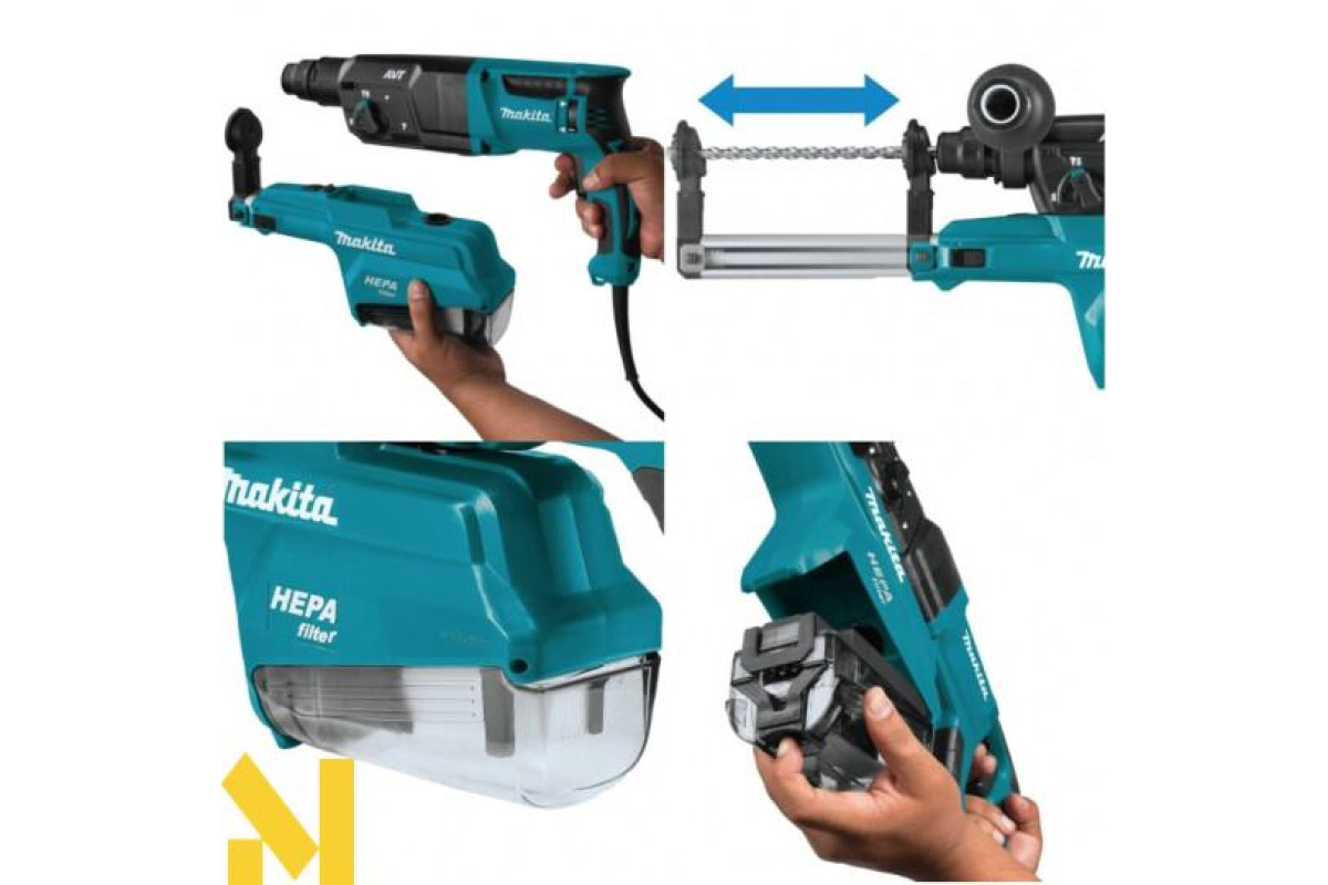 - Безпечне з'єднання між всмоктуванням пристроєм і перфоратором запобігає витоку пилу;
