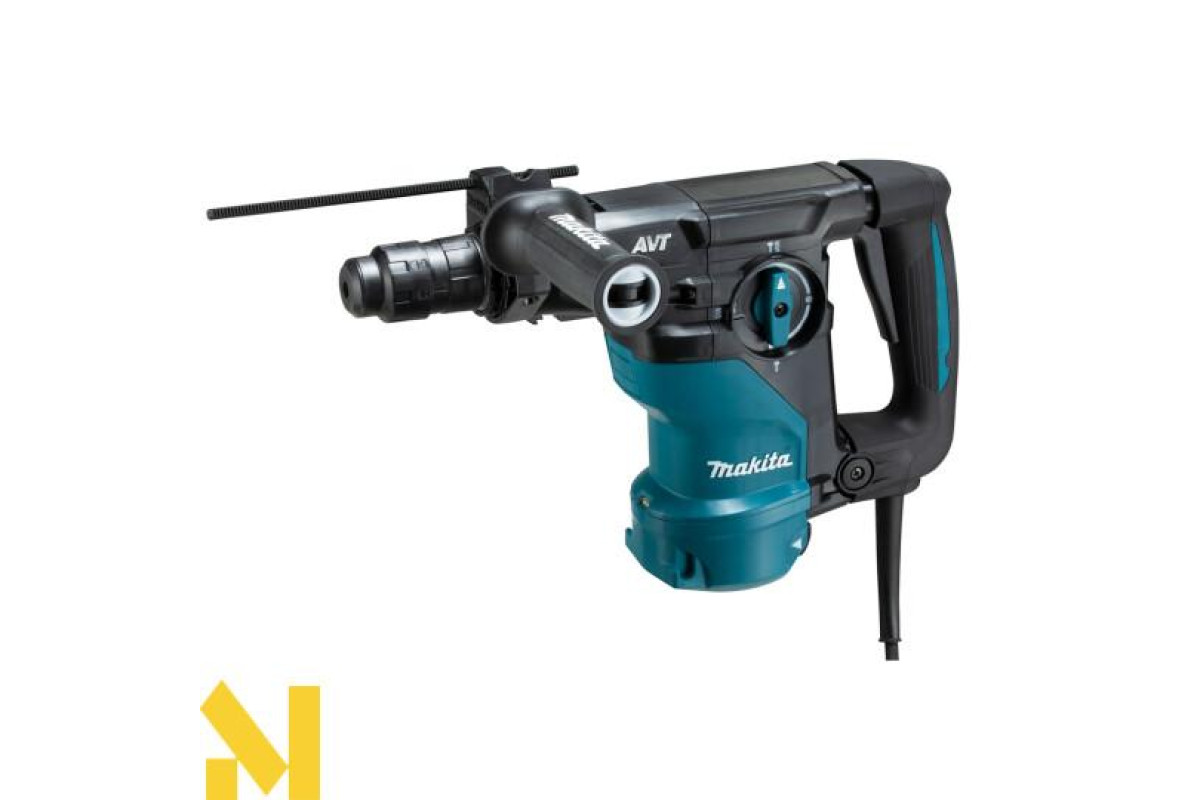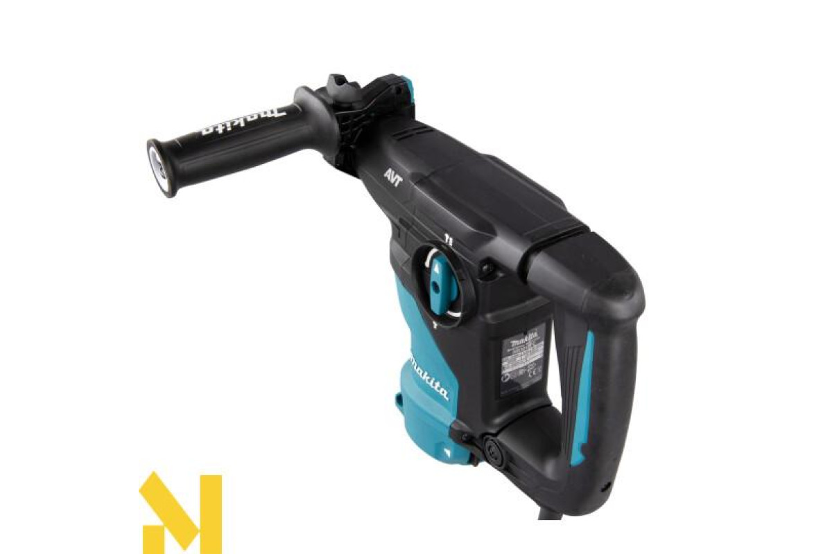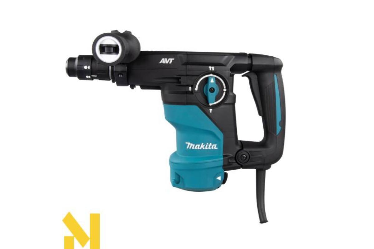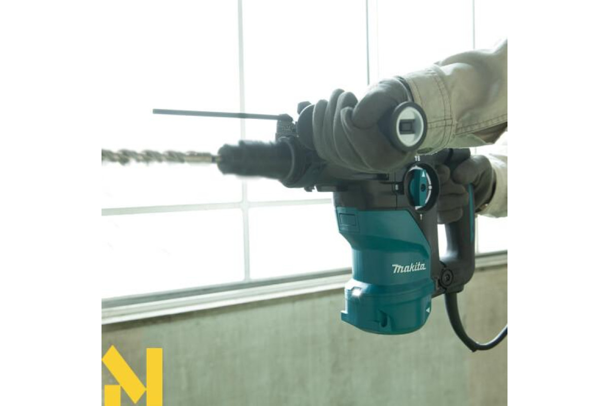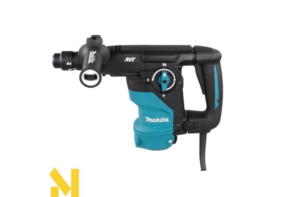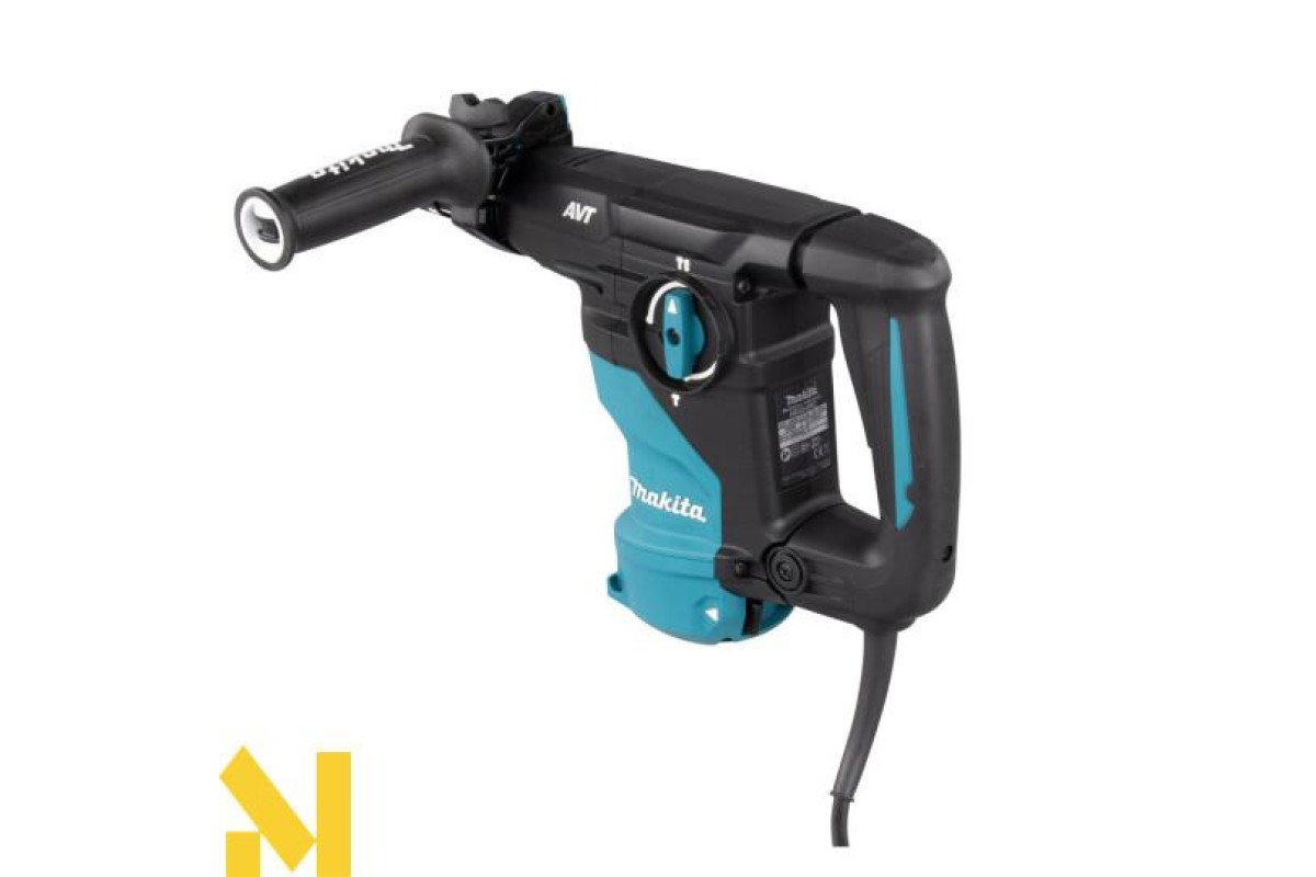 Дротовий перфоратор HR3012FCWJ з патроном SDS-Plus, потужністю 1050 Вт, унікальною антивібраційною системою AVT3 та режимами свердління, ударного свердління та довбання. Він має плавне регулювання швидкості від 0 до 840 об/хв та частоту ударів від 0 до 4500 об/хв за допомогою курка-перемикача, а також енергію удару 3,6 Дж. Максимальна глибина свердління в бетоні становить 30 мм. Фрикційна муфта захищає користувача у разі заклинювання свердла. Він має два різні механізми противаги: - противагу, який зменшує вібрації, спричинені довбанням;