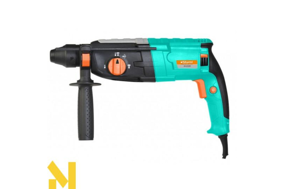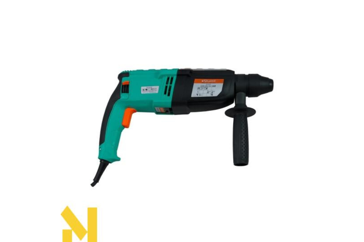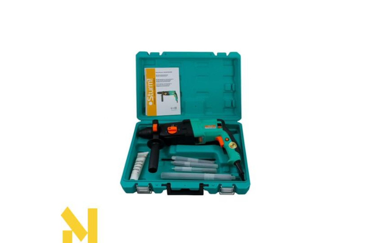 Перфоратор Sturm оснащений системою SDS-plus для швидкої і зручної зміни бура. Інструмент поставляється з набором оснащення в зручному пластиковому кейсі.