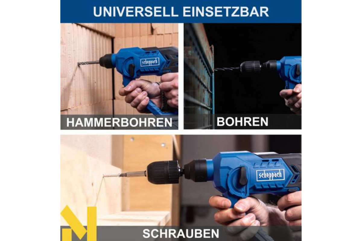 Потужний акумуляторний ударний перфоратор Scheppach C-RHD130-X ідеально підходить для свердління, ударного свердління та загвинчування шурупів, що робить його ідеальним для використання в майстерні, вдома або на будівельних майданчиках. Центральний перемикач дозволяє швидко та без інструментів вибрати одну з трьох функцій. Як частина серії Scheppach IXES 20-вольт, усі акумулятори та зарядні пристрої системи можна комбінувати з ударним перфоратором. Акумулятори та зарядні пристрої доступні окремо.