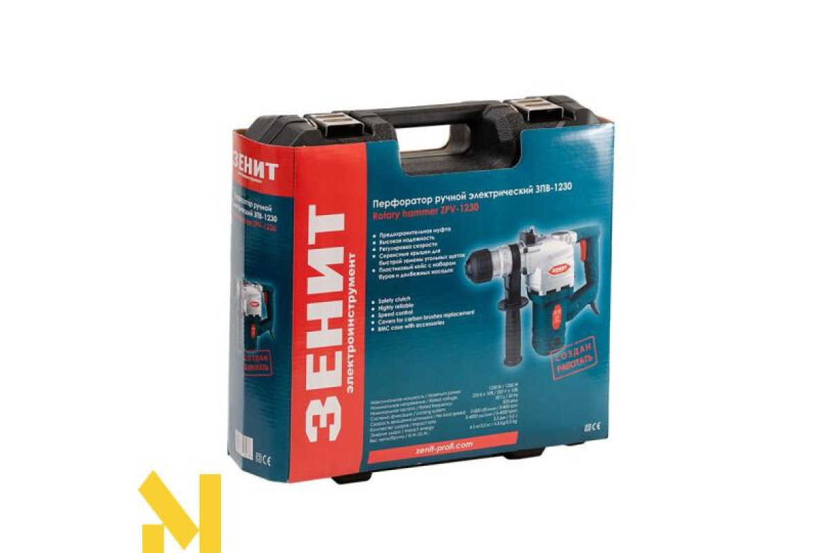 Перфоратор ручний електричний ЗЕНІТ ЗПВ 1230 призначений для роботи в трьох режимах: свердління / свердління + удар / удар (довбання). Однофазний колекторний двигун має посилену подвійну ізоляцію, його максимальна потужність складає 1230 Вт. Модель оснащена електронним регулятором частоти обертів шпинделя, системою фіксації насадок SDS-plus та сервісними кришками для швидкої зміни вугільних щіток при необхідності. Потужна, маневрена конструкція має вагу 4,5 / 5,0 кг. "