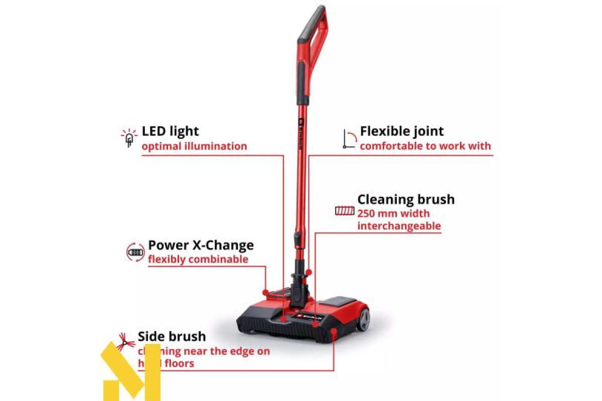 Компактна та легка конструкція разом із регульованою телескопічною ручкою з м’якою ручкою забезпечує невтомне та ергономічне підмітання для кожного користувача. Знімна щітка шириною 250 мм оснащена високоякісною щетиною, яка може очищати всі тверді підлоги та килими від сухого бруду, такого як пил, стружки або крихти, за допомогою вбудованої очисної губки. Бічна щітка додатково гарантує, що підмітання можна виконувати на твердих підлогах близько до краю.