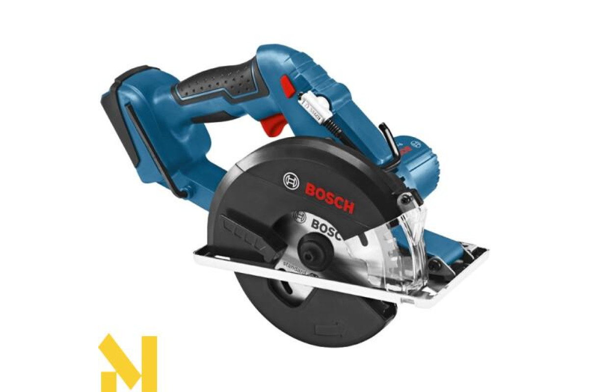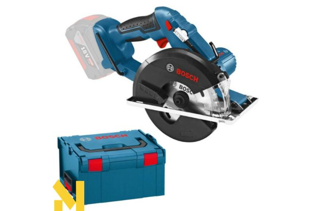 Циркулярка Bosch GKM 18 V-LI, діюча від 18 В Li-Ion акумулятора 4 А*год, пиляє 130-136 мм дисками з посадкою 20 мм. Диск, обертаючись зі швидкістю 4250 об/хв, розпилює чорні метали, виконуючи пропил глибиною до 5 см. Блокування шпинделя для безпечної заміни диска. Модель під номером замовлення 06016A4001 поставляється в L-Boxx 238 с пильним кругом і паралельним упором, без елемента живлення та зарядного пристрою.