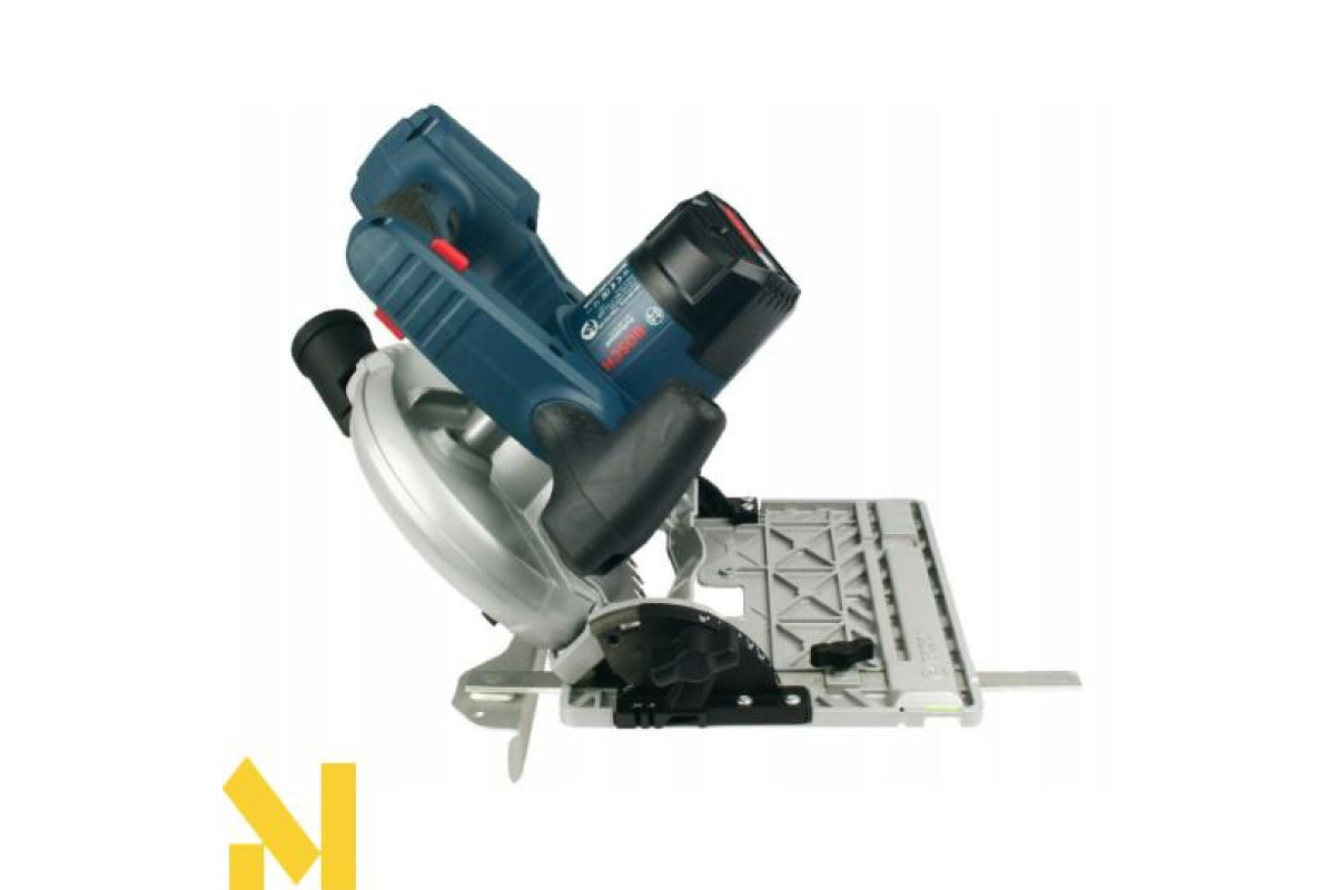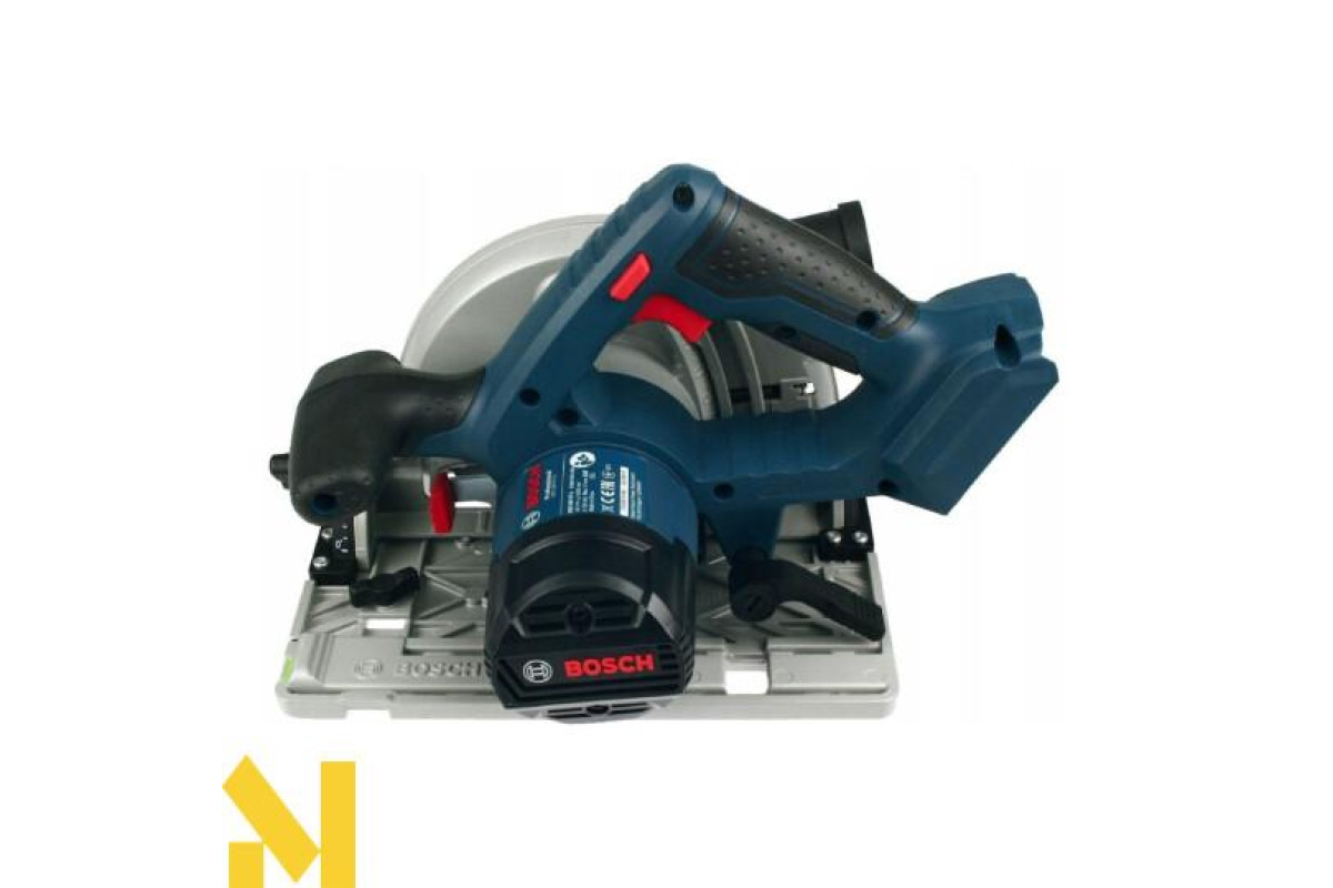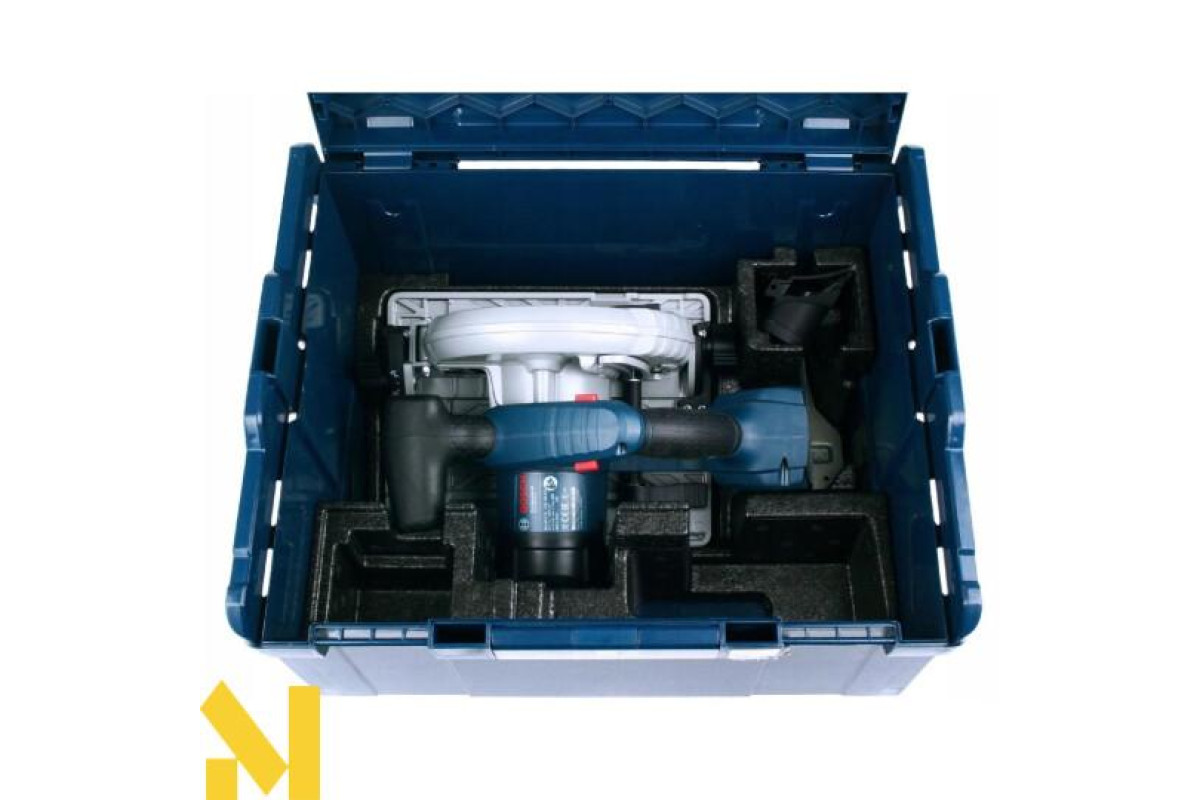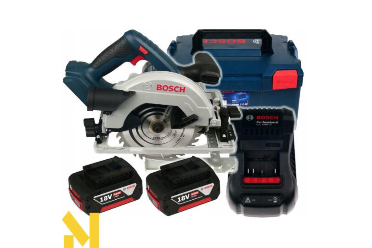 Потужна циркулярка Bosch GKS 18V-57 G, що працює на літій-іонному 18-В, 5-приміщення повинна бути захищена акумуляторі, виконує в деревині рівні поздовжні і поперечні різи глибиною 57 мм і косі зрізи під кутом 45 градусів глибиною 42 мм. Пильний диск діаметром 165 мм з посадкою 20 мм встановлений на правій стороні інструменту і за хвилину робить 3400 обертів. Блокування шпинделя. Опорна плита 252 × 194 мм. Поставляється в L-Boxx 238 з направляючою рейкою FSN, паралельним упором, двома акумуляторами, зарядним пристроєм і адаптером для підключення пилососа.