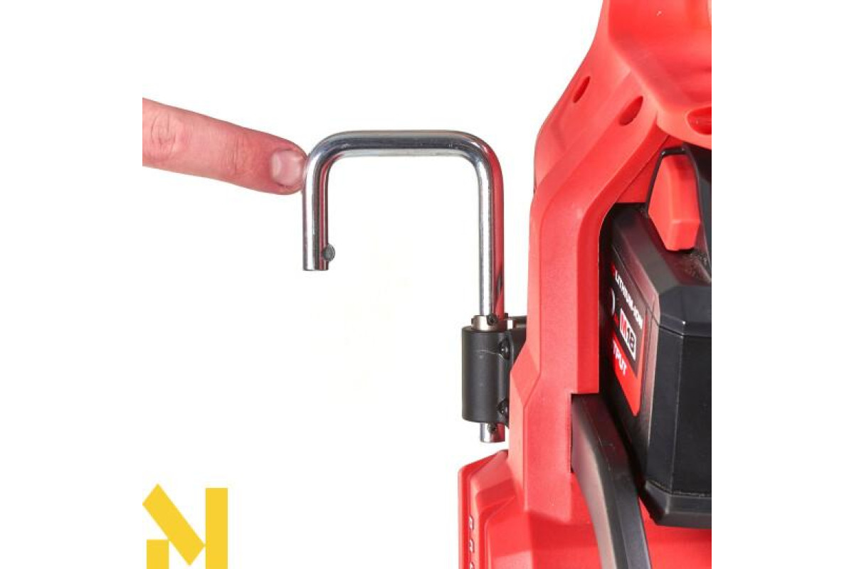 Міцний металевий складний гак дозволяє зручно та безпечно зберігати інструмент на робочому майданчику