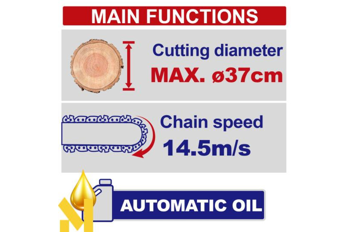 Ланцюгова пила оснащена сучасними системами безпеки, такими як захисний кожух і блокування пускової кнопки, що знижує ризик нещасних випадків і забезпечує безпечну експлуатацію інструменту.