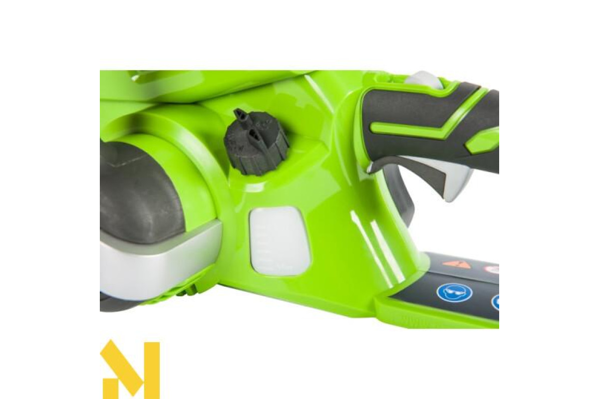 Для зручності роботи з пилою рукоятка прогумована і має ергономічну форму. Система автоматичного змащення подовжить термін служби шини і ланцюга, а для контролю рівня оливи бачок має прозорий корпус. Для безпеки передбачено кнопку-запобіжник від випадкового старту і щиток для захисту рук від порізів.