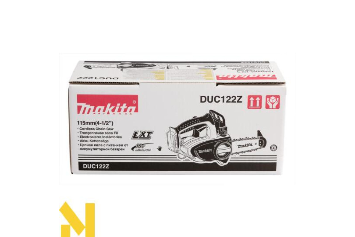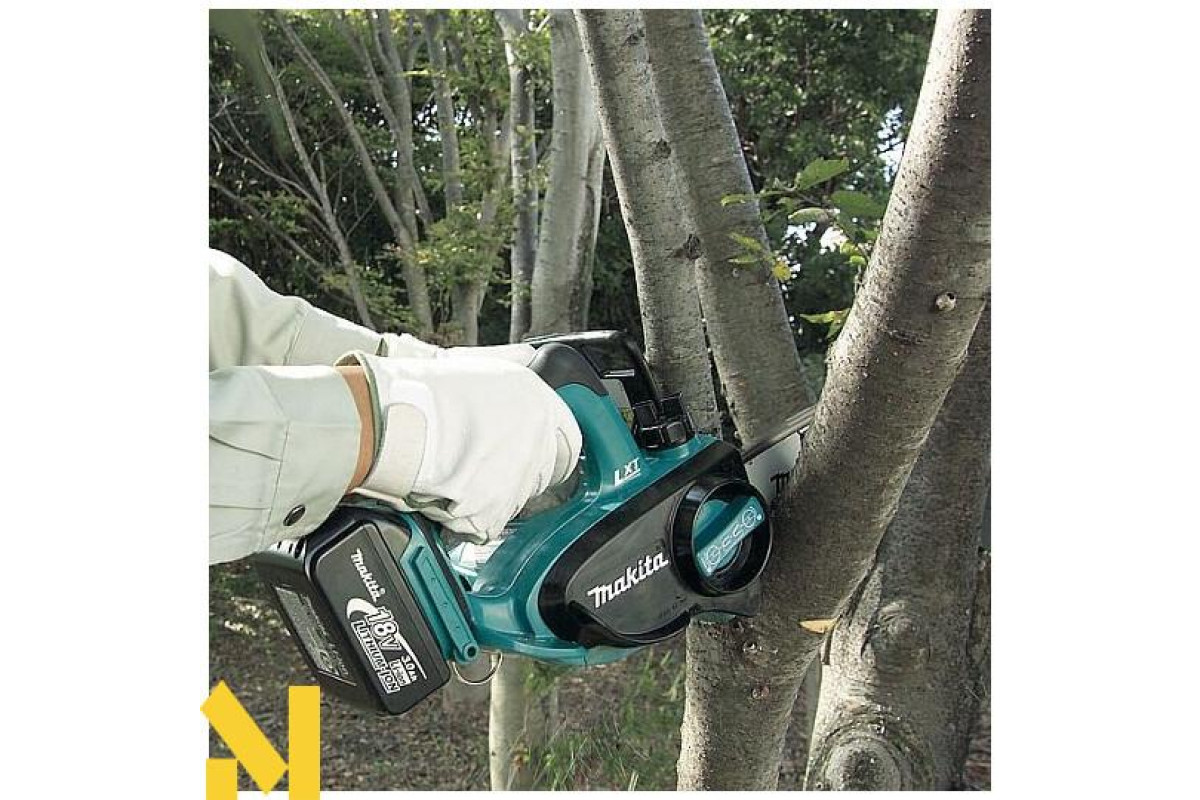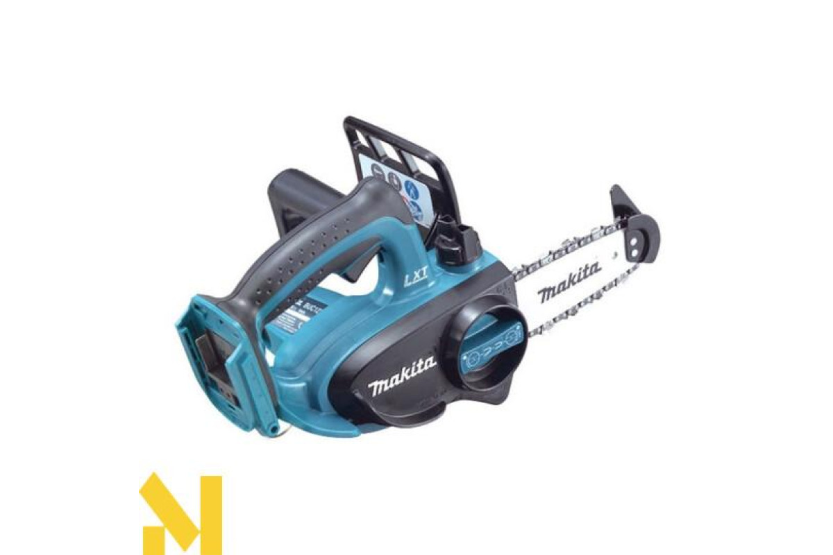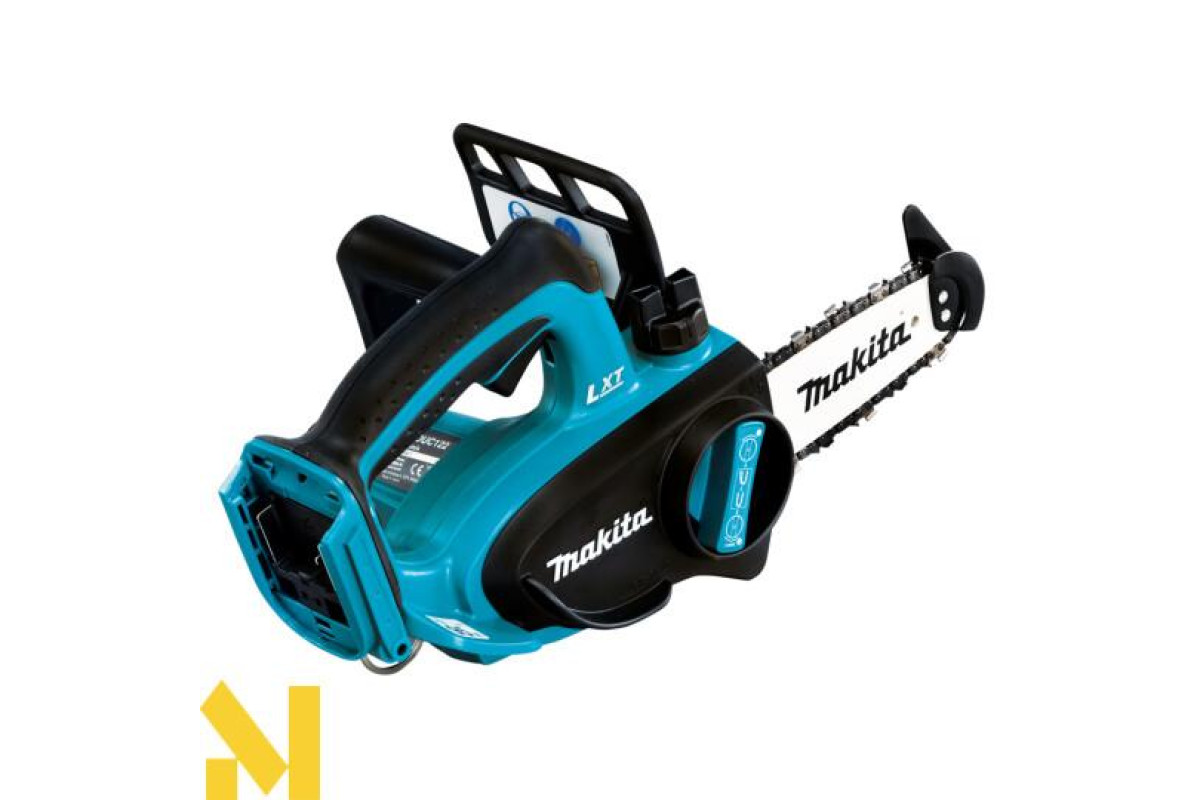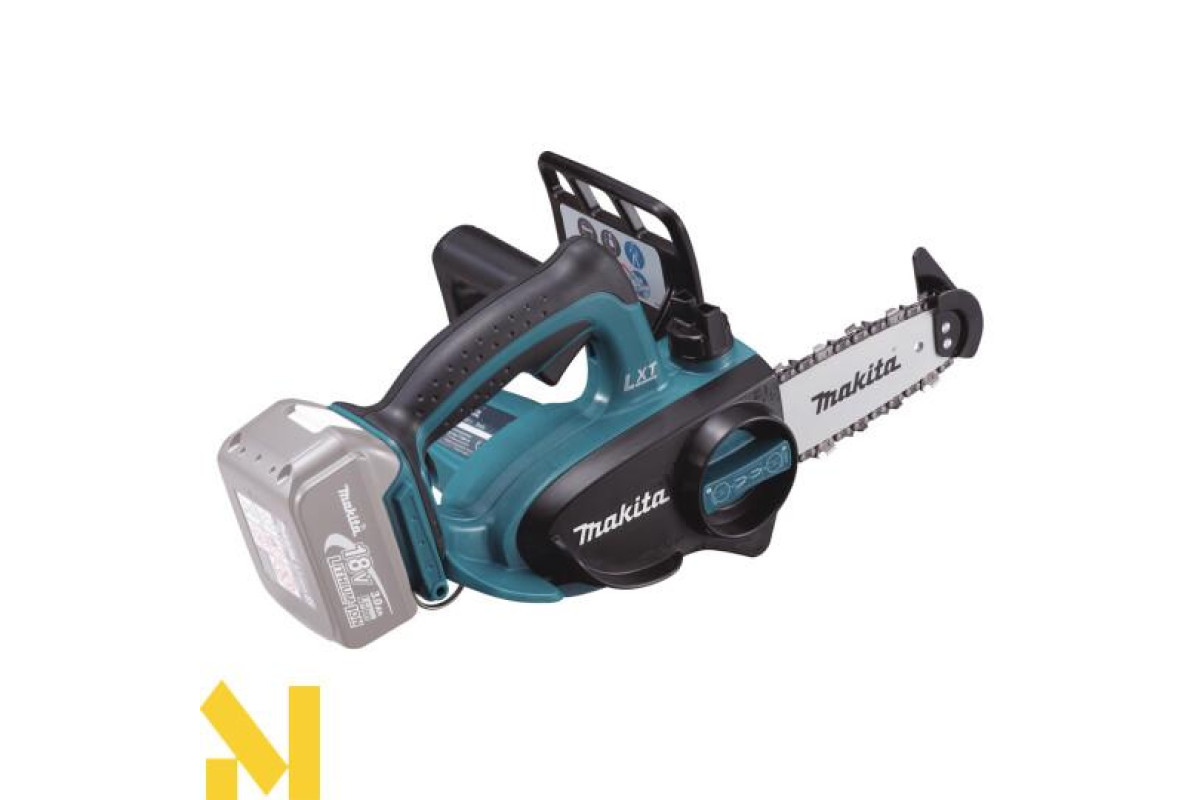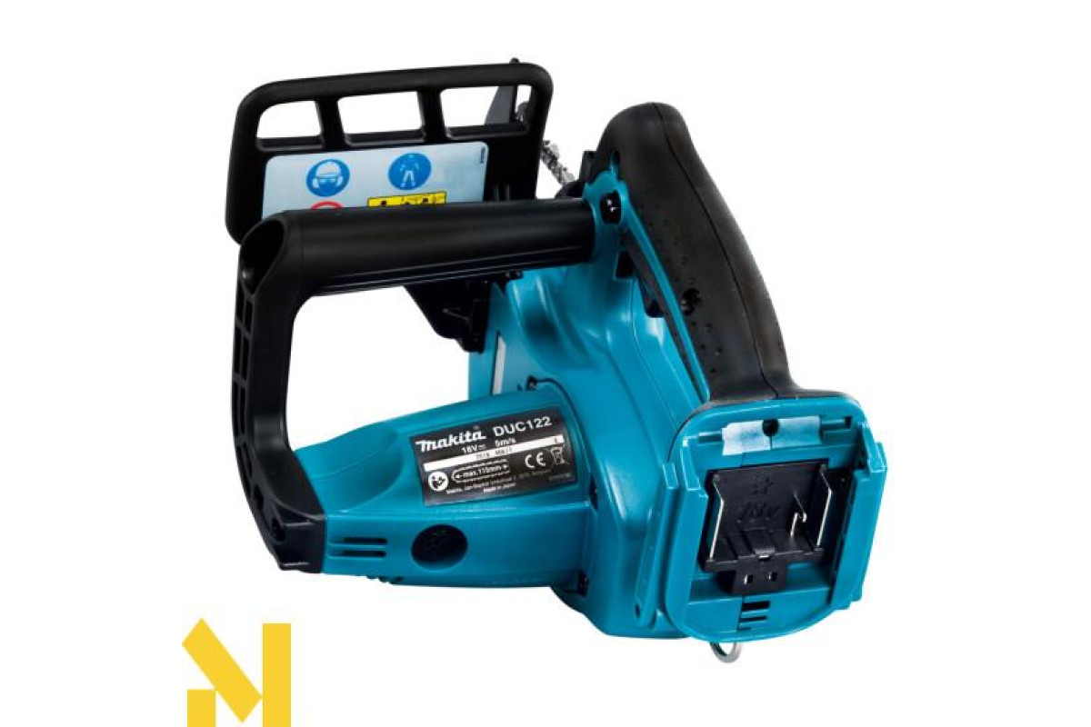 Makita DUC122Z - це акумуляторна ланцюгова пила, призначена для розпилювання деревини. Гумові вставки на рукоятках гасять вібрацію і дозволяють збільшити контроль над пилкою. Пила оснащена блокуванням від випадкового пуску. При вибігу ланцюга спрацьовує аварійне гальмо (швидкість спрацьовування всього півсекунди).