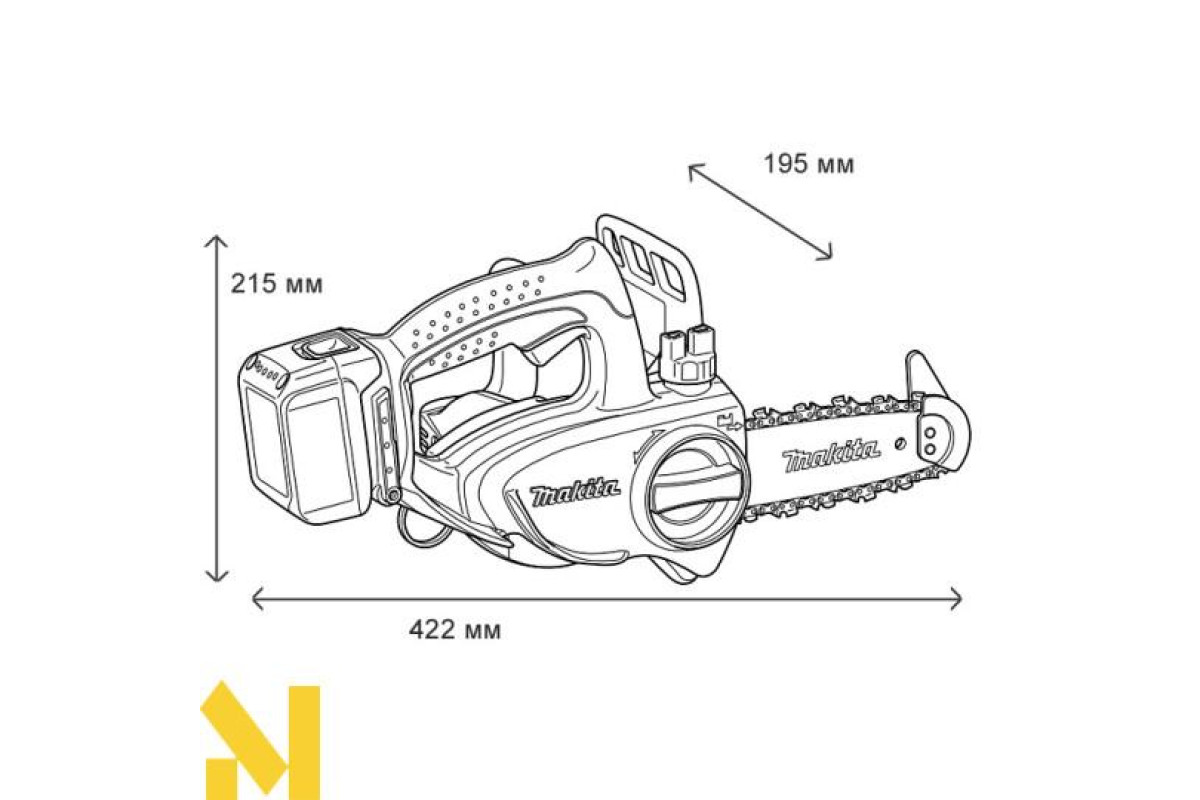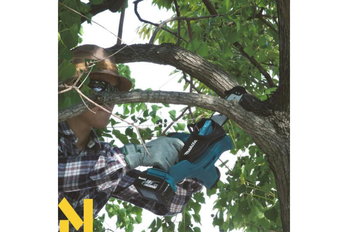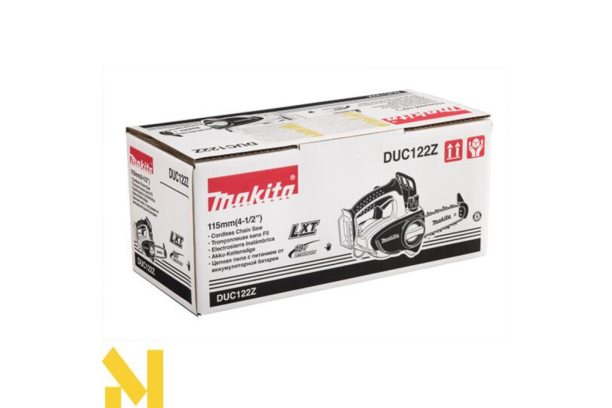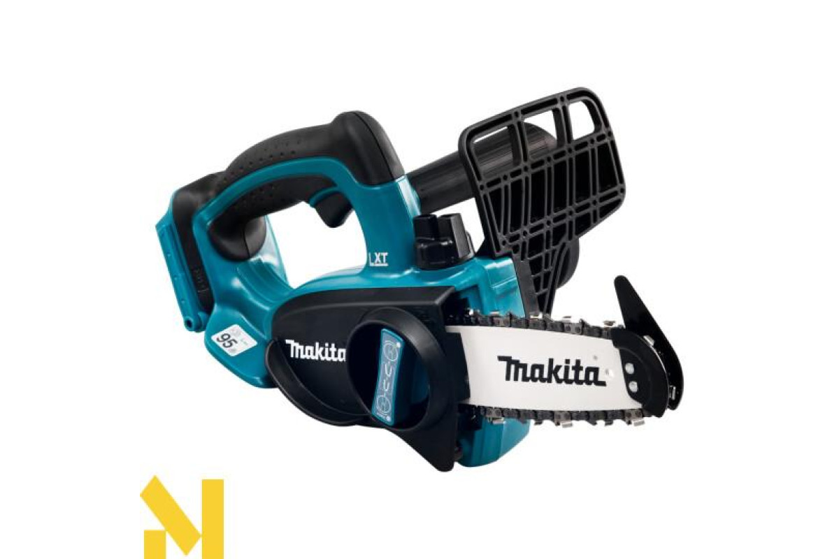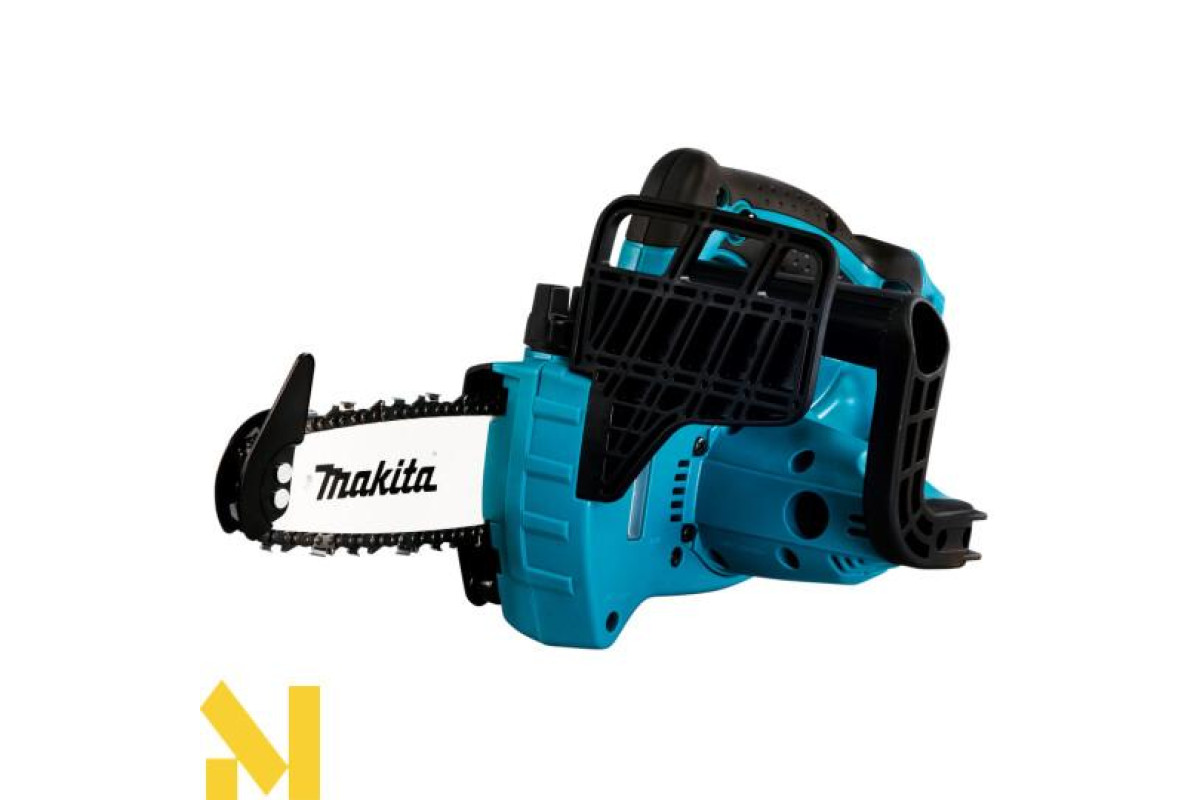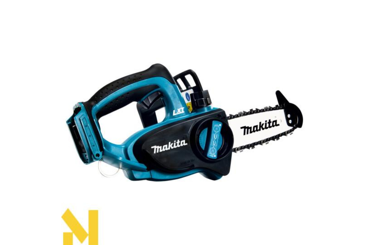 Makita DUC122Z - це акумуляторна ланцюгова пила, призначена для розпилювання деревини. Гумові вставки на рукоятках гасять вібрацію і дозволяють збільшити контроль над пилкою. Пила оснащена блокуванням від випадкового пуску. При вибігу ланцюга спрацьовує аварійне гальмо (швидкість спрацьовування всього півсекунди).