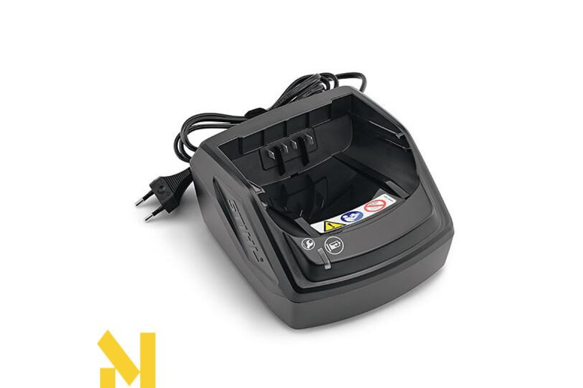 Зарядний пристрій для акумуляторних батарей акумуляторної системи STIHL COMPACT. Із світлодіодним індикатором та застібкою-липучкою і вушком на корпусі для акуратного кріплення кабелю. Зарядний пристрій має спеціальні отвори для встновлювлення на стіні. Відомості відстань між отворами для кріплення нанесені на корпус пристрою.