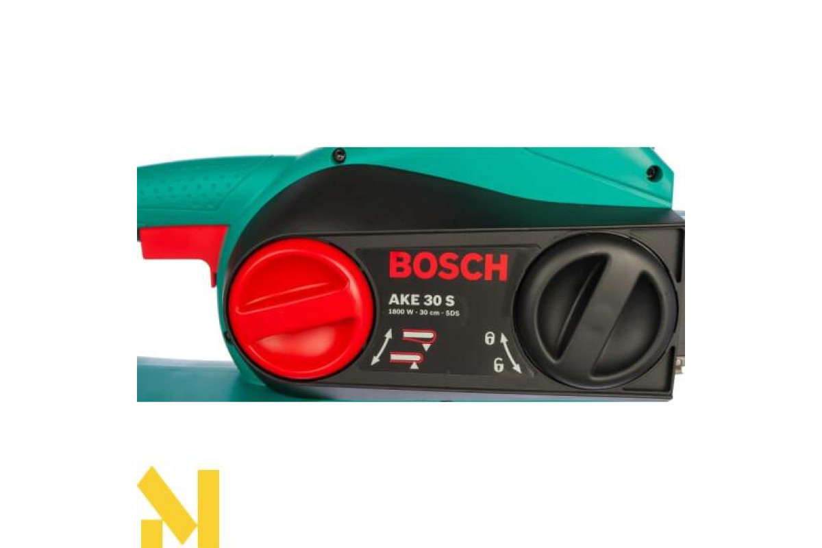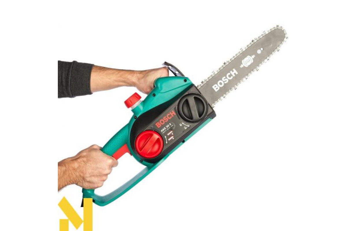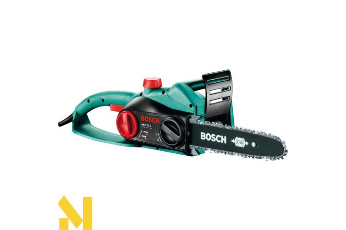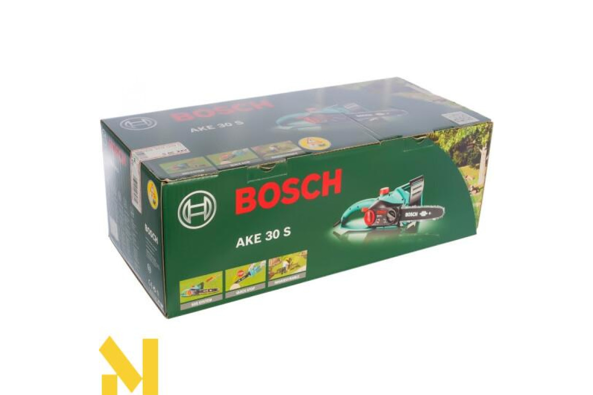 Садова ланцюгова пила Bosch AKE 30 S вагою близько 4 кг з електродвигуном потужністю 1800 Вт розпилює деревину всіх порід уздовж і поперек волокон. Хромований ланцюг на 30-см направляючій шині рухається зі швидкістю 9 м/с. Товщина ланки ланцюга 1,1 мм. Безінструментальна натяжка ланцюга. Автоматичне мастило. Гальмо для захисту від зворотного удару і уловлювач ланцюга.