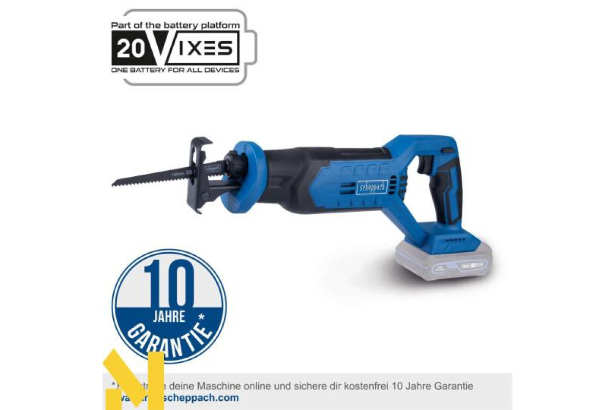Акумуляторна шабельна пилка Scheppach C-RS100-X дозволяє виконувати точні розрізи деревини, пластику, кольорових металів або будівельних матеріалів з мінімальними зусиллями. Розсувна опорна плита дозволяє змінювати глибину різання. Швидкозатискний патрон також дозволяє швидко змінювати полотно без необхідності використання додаткових інструментів. В рамках серії Scheppach IXES 20 вольт усі акумулятори та зарядні пристрої системи можна комбінувати з шабельною пилкою. Акумулятор та зарядний пристрій продаються окремо. Акумуляторна шабельна пилка постачається з пилковим полотном для дерева та шестигранним ключем.