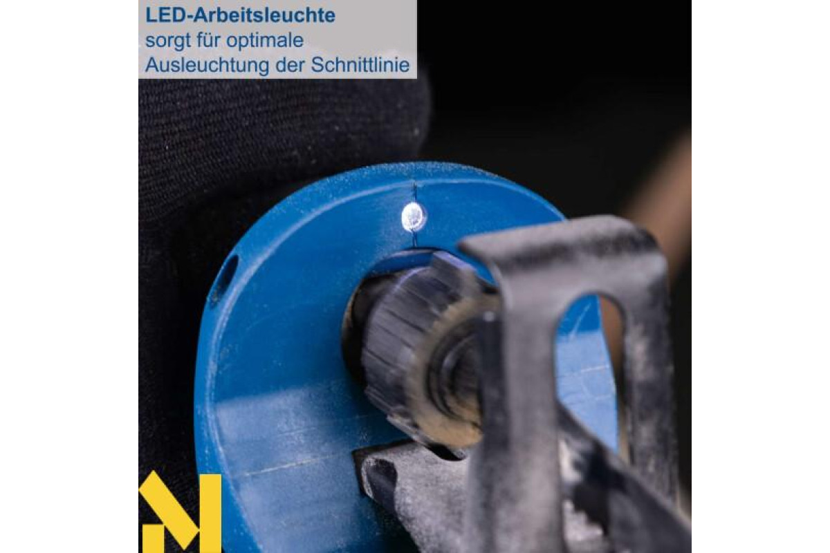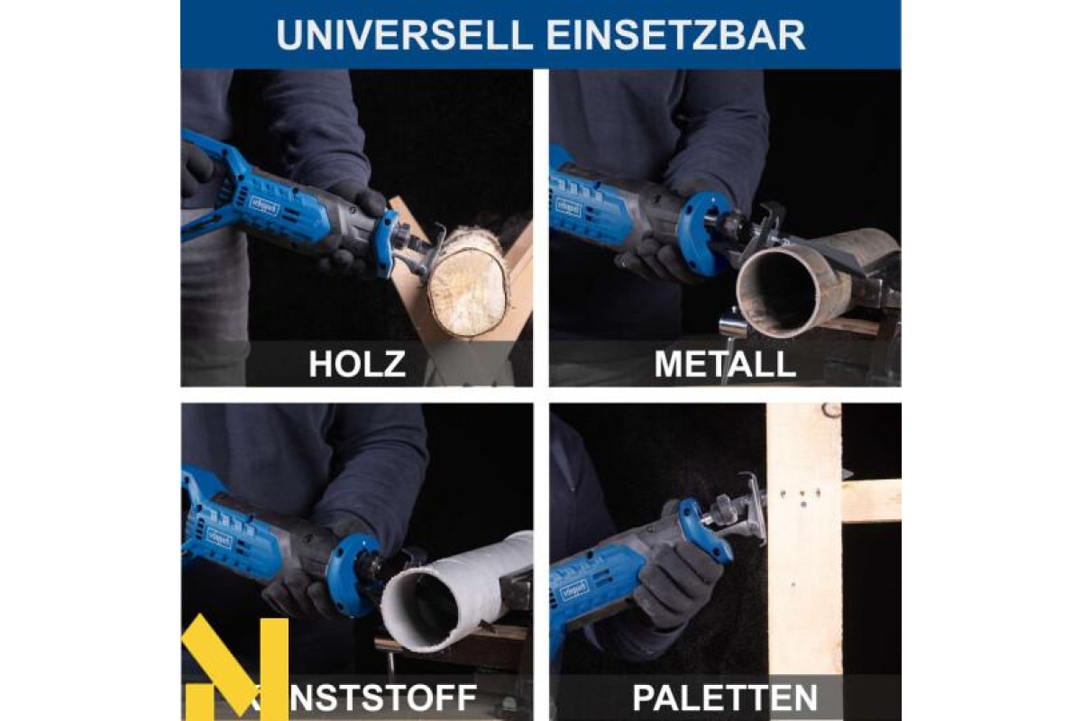 Потужна акумуляторна зворотно-поступальна пилка для розрізання деревини, пластику, кольорових металів або будівельних матеріалів (при використанні відповідного пильного диска)