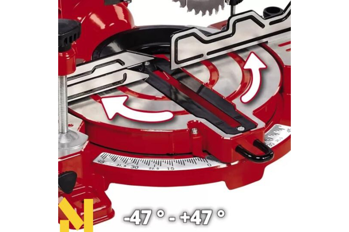 - робочий стіл повертається до 47 градусів в обидві сторони, а в популярних положеннях є фіксатори для легкого налаштування пиляння;