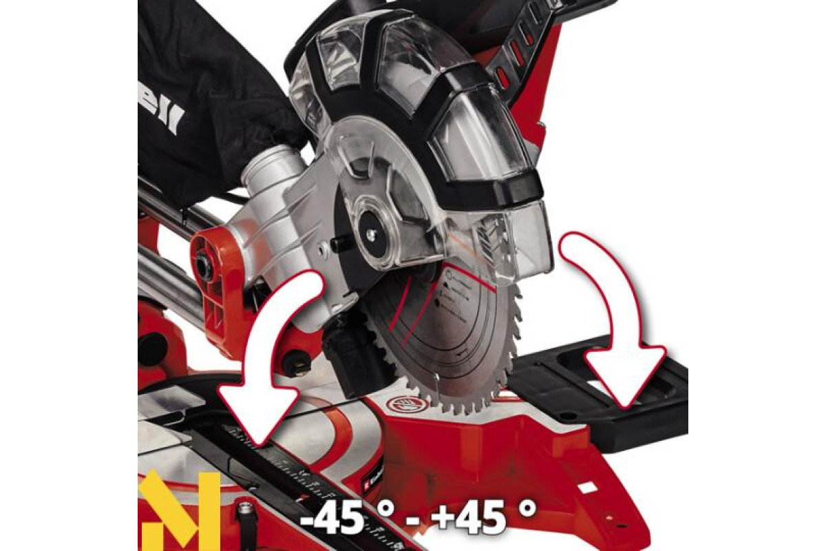 Пила торцювальна Einhell TC-SM 2131/1 Dual з функцією протягування може бути застосована для широкого спектру робіт. Високоякісний пильний диск з твердосплавними напайками і функція протягання забезпечують чистий і точний розпил широких заготовок. Поворотний стіл пили забезпечений функцією точного встановлення кута розпилу з можливістю фіксації найбільш поширених кутів. Пильна головка нахиляється вліво і вправо на кут до 45 °. Шкали кутів нахилу і повороту легко читані. Вбудований лазерний покажчик різу, що живиться від мережі, дозволяє ідеально точно здійснювати розпил заготовки. Пиловловлювач дозволяє ефективно видаляти деревний пил і тирсу.
