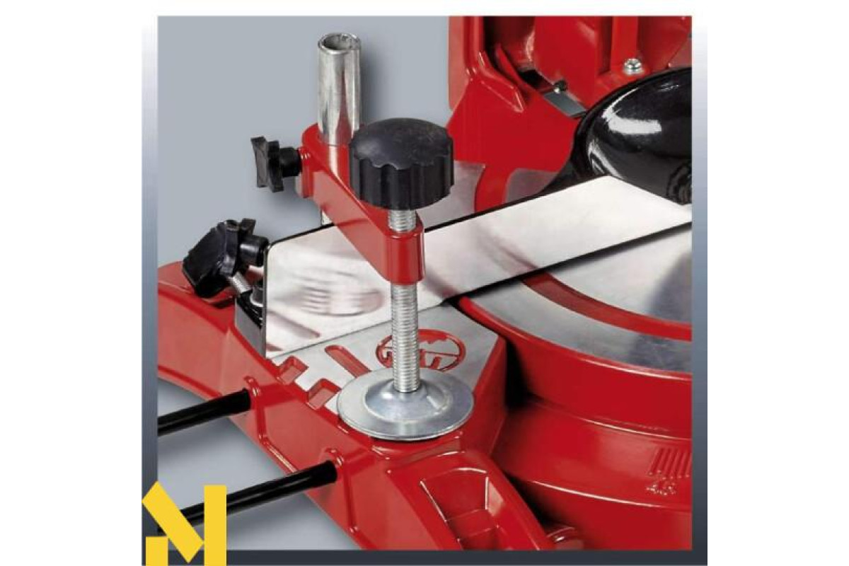 Для підвищення точності пила Einhell TH-MS 2513 L оснащена лазерним модулем, промінь лазера проектується на оброблювану заготовку в площині різання. Пила має затискні пристрої для фіксації заготовки.