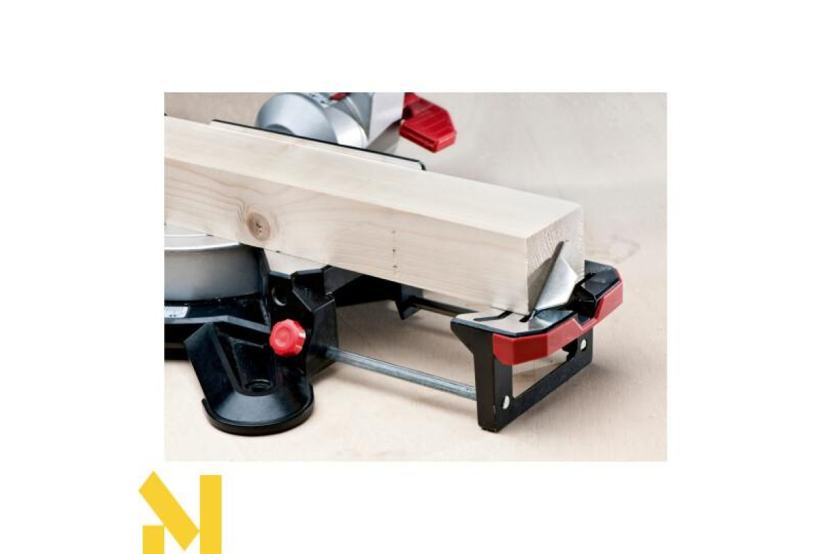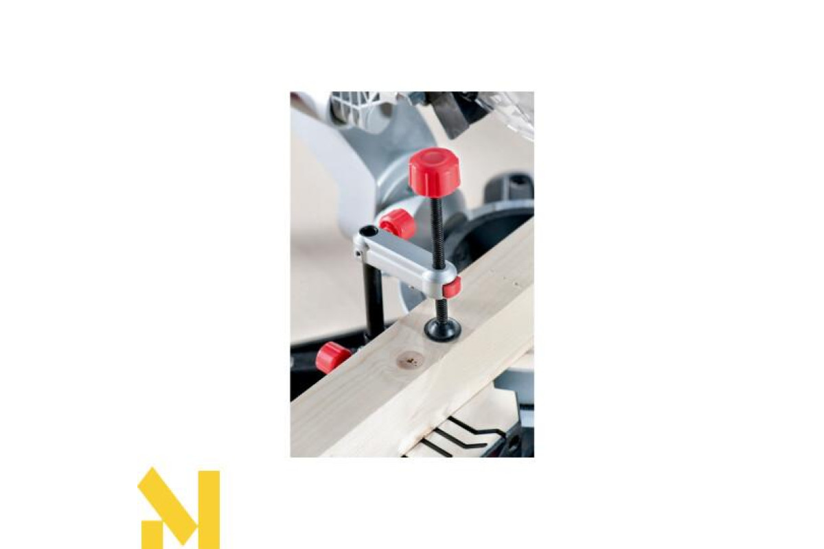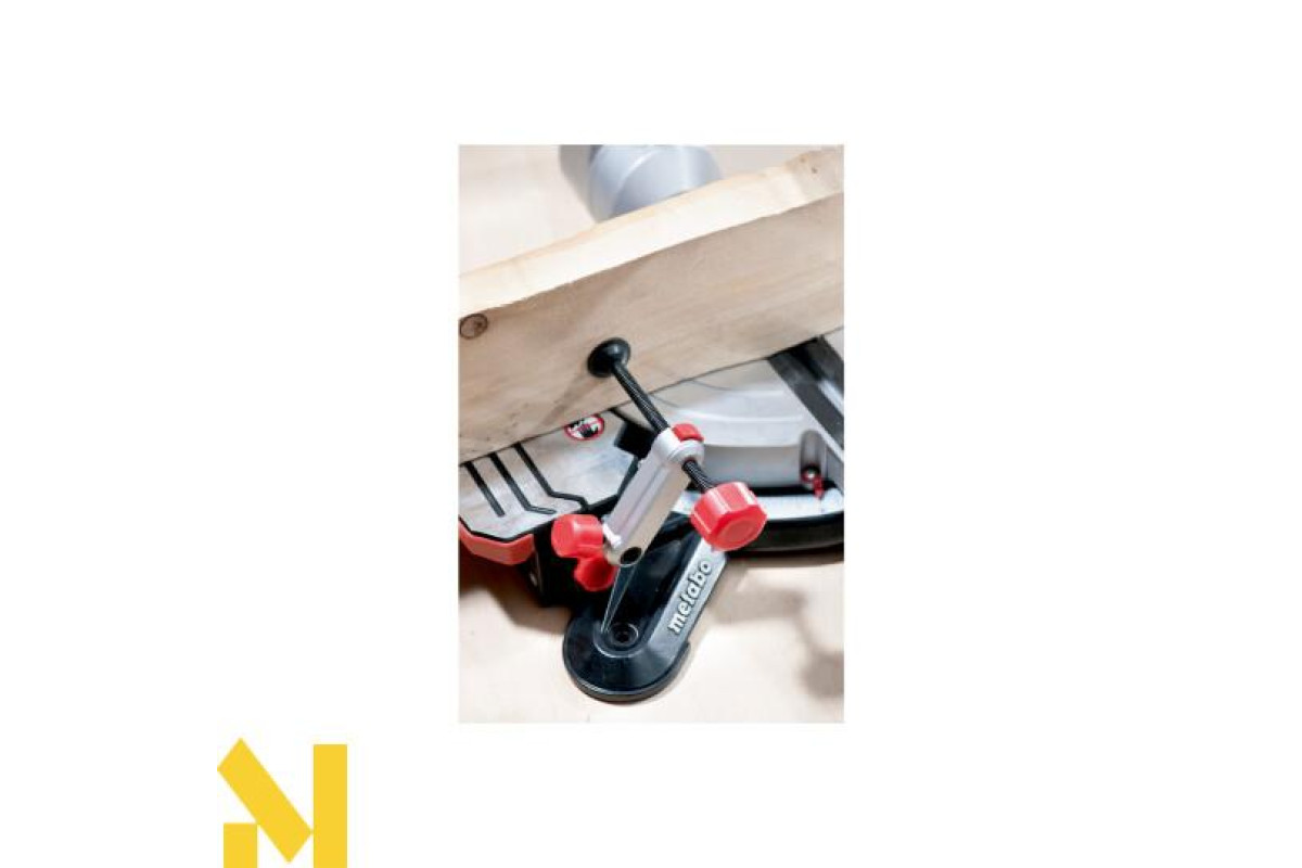 Притискна струбцина та бічні упори на розширювачах столу дозволяють чітко зафіксувати заготовку та виконати точний відріз.