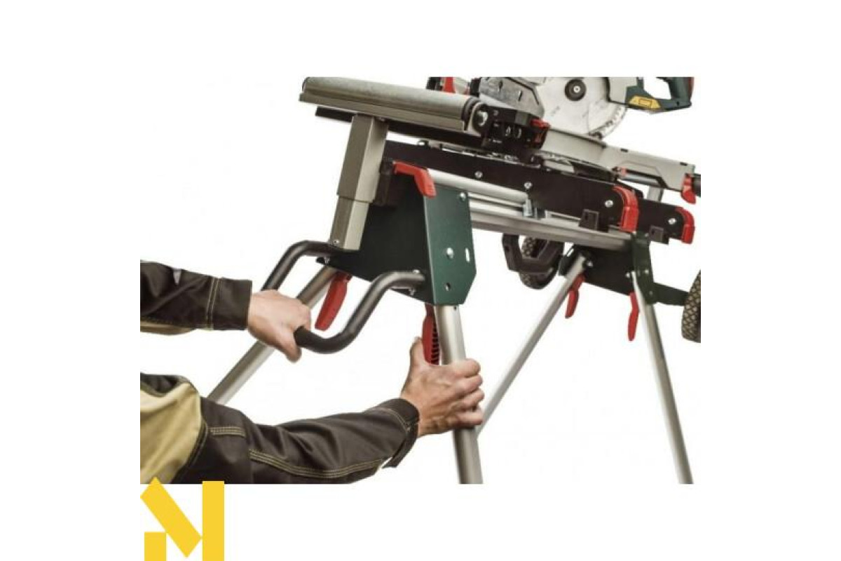 Зручний, міцний і довговічний стіл дозволяє комфортно розташувати пилу в майстерні або на будівельному майданчику. Інструмент надійно фіксується на столі, що зводить до мінімуму підготовчі роботи при серійному розпилюванні.