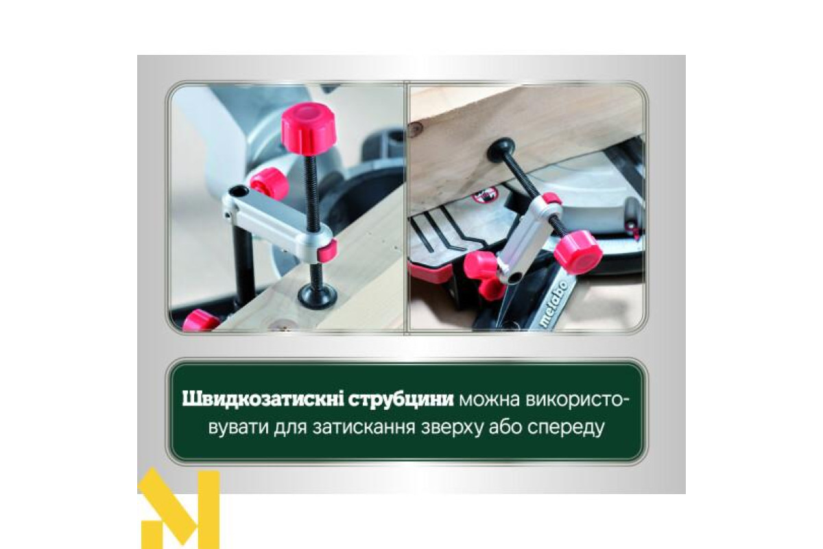 - Притискна струбцина і бічні упори на розширниках гарантують надійну фіксацію матеріалу.