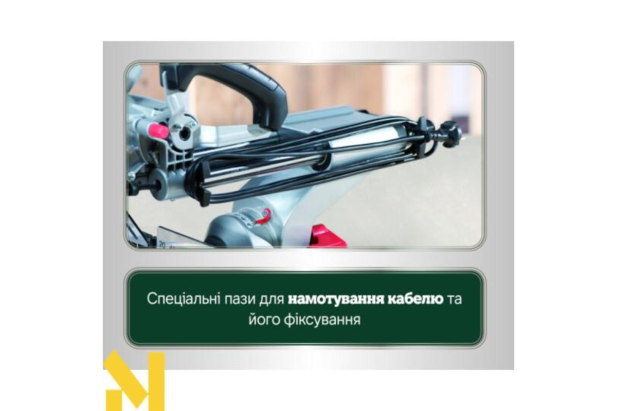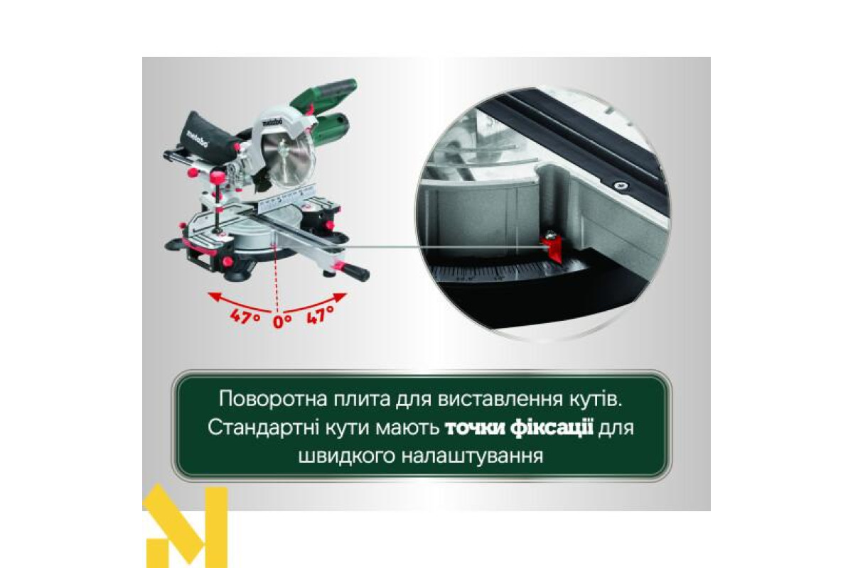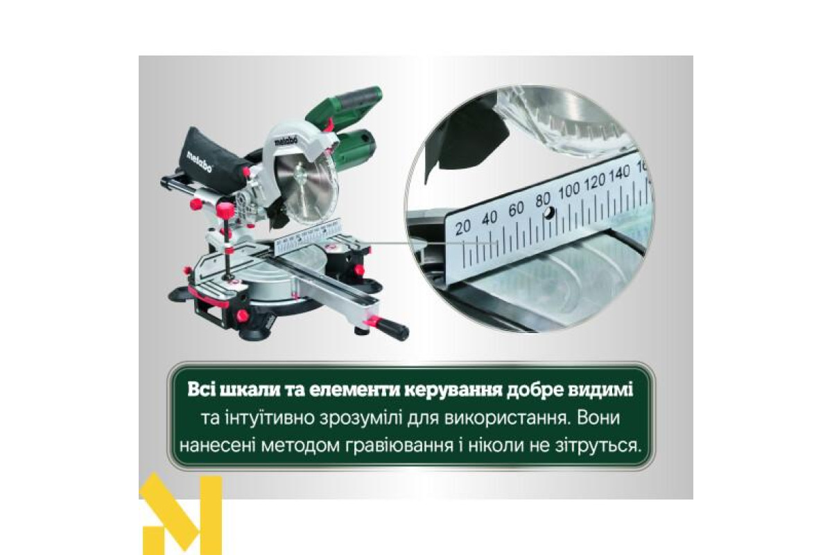 - Добре видимі з будь-якого робочого положення шкали кутів повороту столу і нахилу пильноъ головки. Пила має фіксатори на найпопулярніших кутах повороту столу.